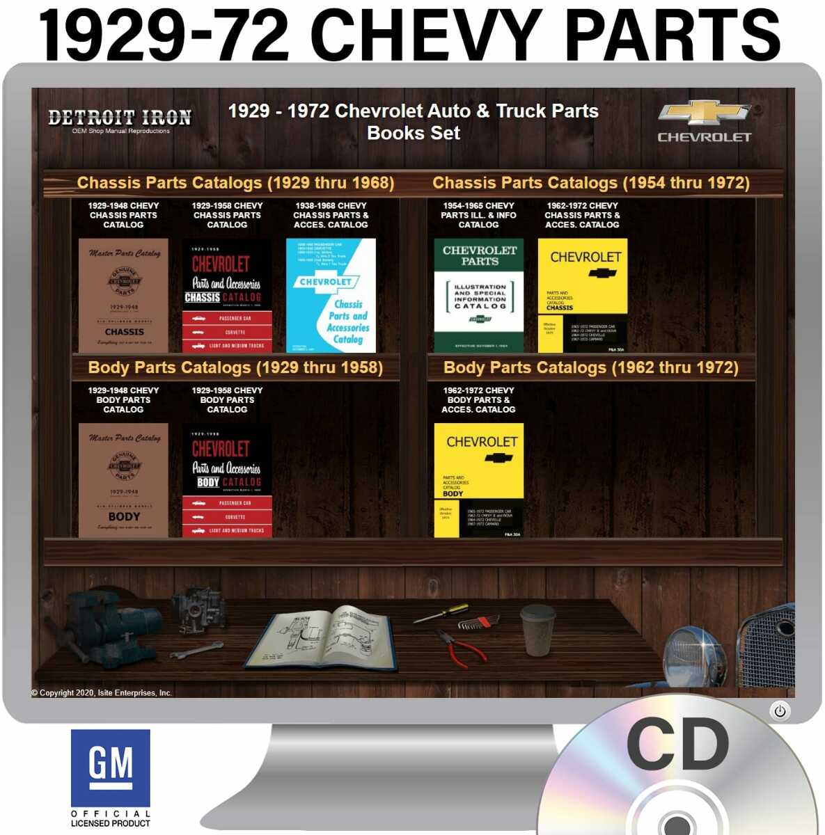 The 1929-1972 Chevrolet Car Truck Parts Manuals (Only) on CD is a digital PDF product licensed by GM. This set of parts catalogs were originally authored by the vehicle manufacturer for use by their dealerships. Features: - Each manual is chapter bookmarked into a single PDF file, allowing for ease of searching - Files are printable and searchable Refer below for specific details included in this Detroit Iron CD product. MANUALS INCLUDED: - 1929-1958 Chevrolet Parts & Accessories Catalog - 1929-1948 Chevrolet Truck Master Parts Catalog - 1938-1968 Chevrolet Chassis Parts & Accessories Catalog - 1954-1965 Chevrolet Parts Illustrations Special Information Catalog - 1965-1972 Chevrolet Parts and Accessories Catalog Chevrolet Models Covered: International, International AC Series Truck, Universal, Universal Truck, AE Independence Truck, Confederate, Confederate BB, Eagle, Eagle CB, Mercury, DB, Master, Standard, Master Deluxe Truck, Standard Truck, Truck, Pickup, GC, GD, GE, Master Truck, HC, HD, HE, JA Master Deluxe, JC, JD, Master 85, VA, KC, KD, KF, KP, Special Deluxe, WA, AJ, AK, AL, AM, AN, Fleetline, Fleetmaster, YR, BJ, BK, BL, BM, BN, BG, DJ, CK, DP, DR, DS, Fleetline Truck, Fleetmaster Truck, Stylemaster Series, Sedan Delivery, Styleline Deluxe, Styleline Special, Bel Air, Corvette, One-Fifty Series, Two-Ten Series, 1500, Nomad, 3100, Del Ray, Biscayne, Brookwood, Impala, Yeoman, 3B, 3C, 3D, 3E, 3F, 3G, El Camino, Kingswood, Parkwood, C10 Panel, C10 Pickup, C20 Pickup, C30 Panel, C30 Pickup, C40, Corvair, K10 Pickup, K20 Pickup, P10 Series, P20 Series, P30 Series, Suburban, Corvair Truck, Chevy II, Chevelle, G10 Van, Malibu, Caprice, C10 Suburban, C20 Panel, C20 Suburban, Camaro, G20 Van, K10 Suburban, K20 Panel, K20 Suburban, P10 Van, K30 Pickup, P20 Van, P30 Van, Blazer, Estate, Nova, Townsman, G30 Van, Monte Carlo, Vega, Luv Pickup A Parts Book provides detailed parts information via exploding diagram cutouts of sections of your vehicle assembly with part numbers and textual descriptions. SYSTEM REQUIREMENTS: Any Operating System (OS) that allows user access to the file system, e.g. Windows, Mac OS, Linux, Chromebook, etc. An HTML Browser such as: Edge, Explorer, Chrome, Safari, Firefox and others. NOTE: No internet connection is required to use this product.