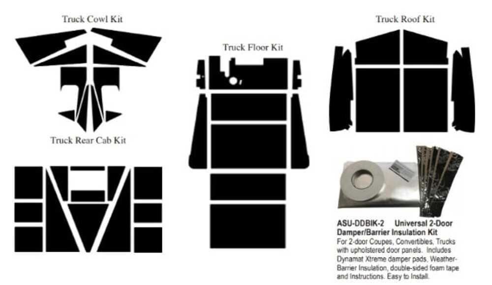 The kit includes cowl insulation, floor insulation, rear cab insulation, roof insulation, and a 2-door damper/barrier kit, providing comprehensive coverage for your truck.
