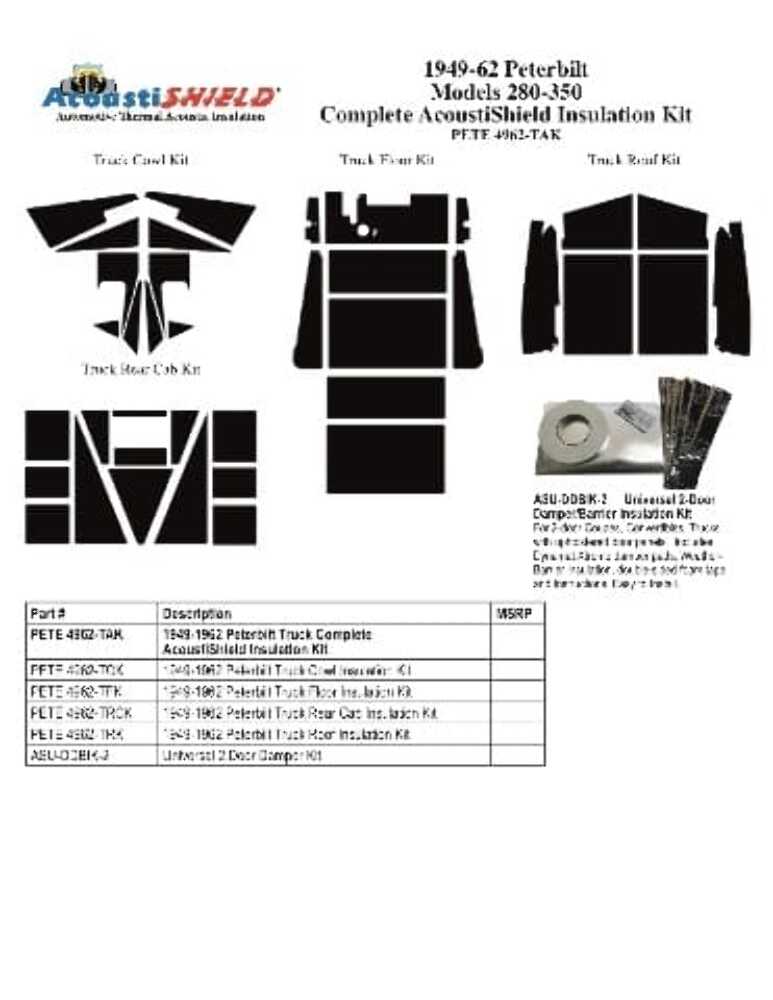 Enhance your 1949-62 Peterbilt Truck Models 280-350 with our Complete Acoustic Kit, designed specifically for classic sound deadening. This insulation sound deadener kit features foil backed jute insulation and sound dampening butyl strips, providing superior noise reduction and thermal barrier benefits for a more comfortable ride.