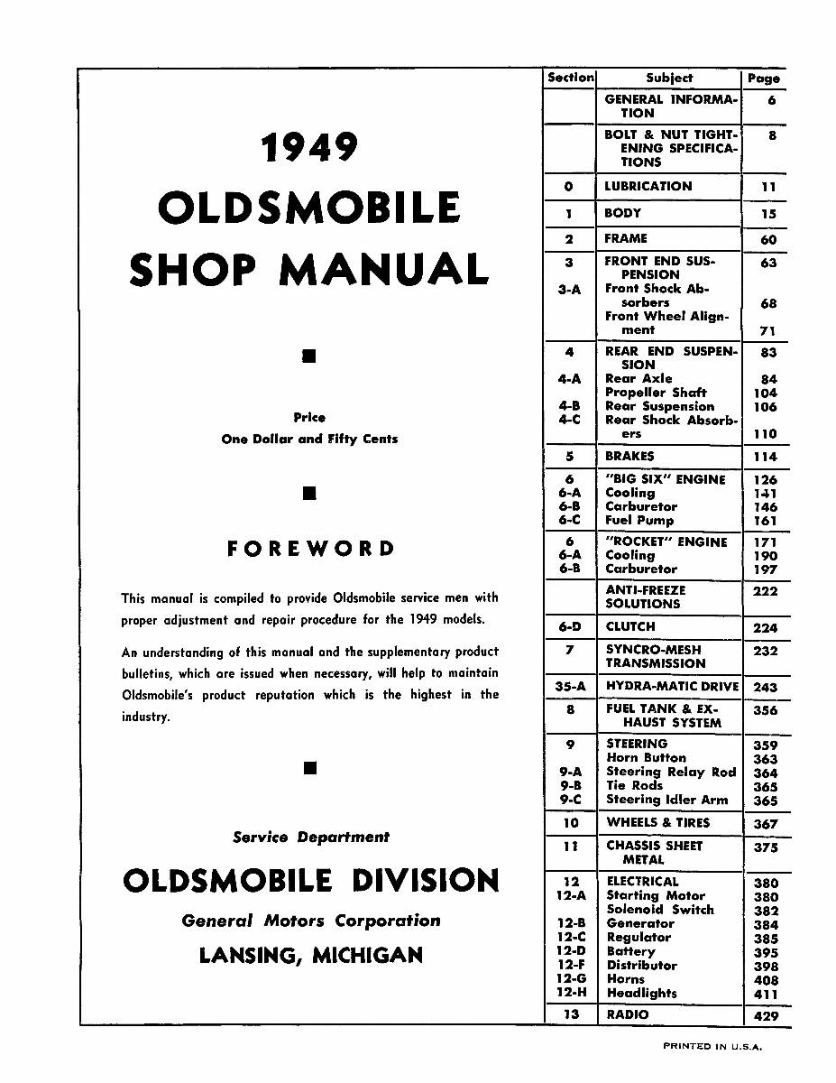 This Repair Manual is specifically designed to fit 1949 Oldsmobile Series 76 vehicles with a Car body style.