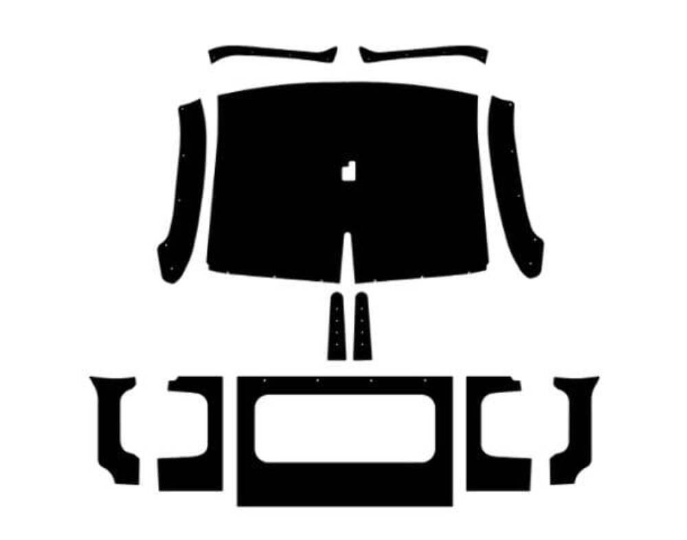 The kit includes the headliner panel, door header panels, windshield stanchions, rear window panel, and binding tape, providing everything you need for a complete installation.