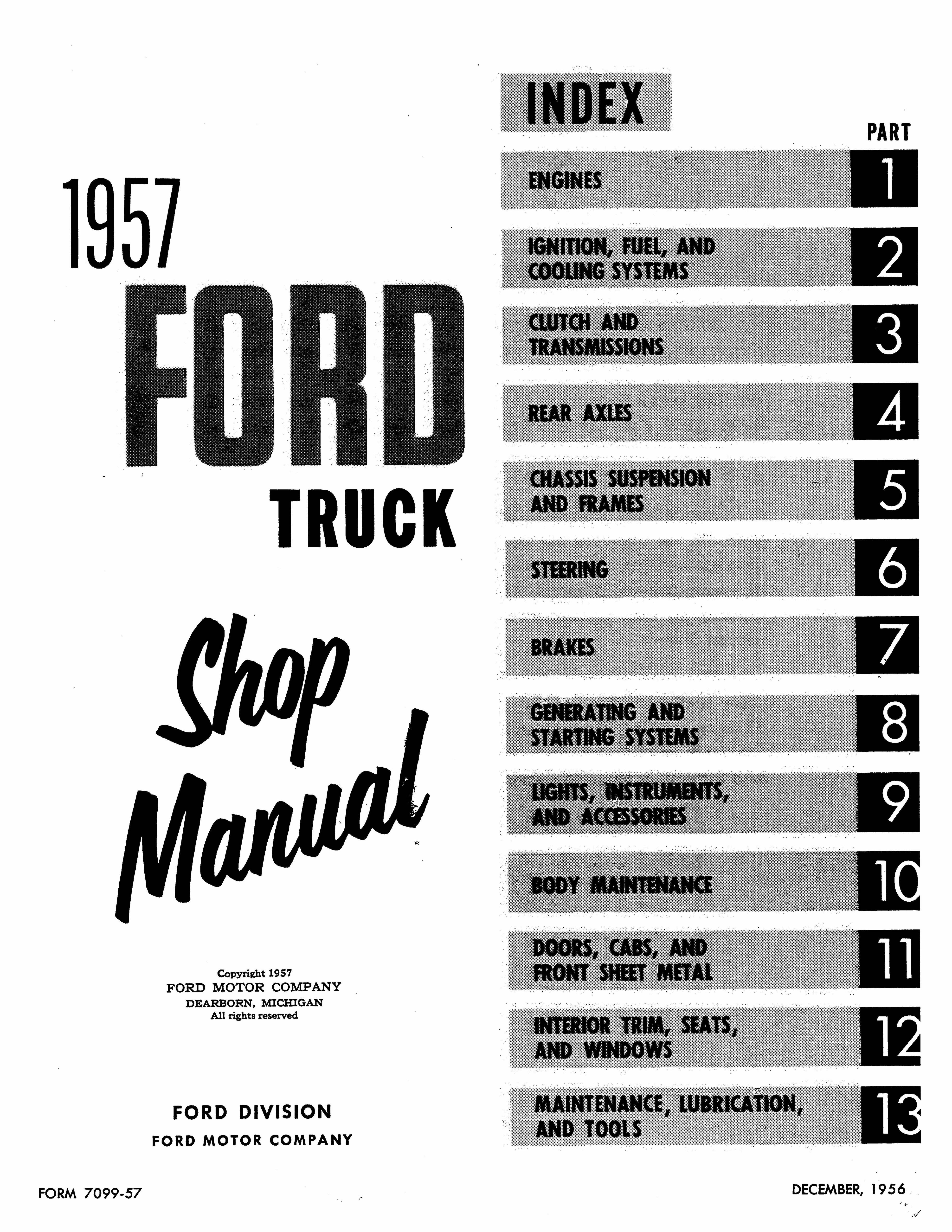 This Repair Manual is specifically designed to fit 1957 Ford F-100 vehicles with a Truck body style.
