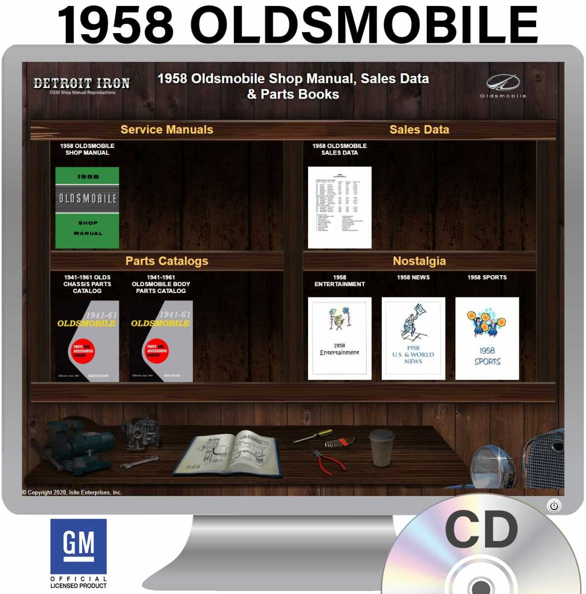 The 1958 Oldsmobile Shop Manual, Sales Data & Parts Books on CD is a digital product licensed by GM. This digital product provides a full set of original equipment manufacturer (OEM) repair and rebuild literature in digital PDF format. This set of manuals and literature were originally authored and published by the car / truck manufacturer to be used by their dealership mechanics so they are very comprehensive. It features an easy-to-use bookcase in a garage scene containing a set of PDF manuals, catalogs, brochures and nostalgia for a specific year, make and model range. Features: - Each manual is chapter bookmarked into a single PDF file, allowing for ease of searching - Files are printable and searchable - The bookcase provides organization of manual types (Service Manuals, Sales Literature, Parts Catalogs & Nostalgia). Refer below for specific details included in the 1958 Oldsmobile Shop Manual, Sales Data & Parts Books Detroit Iron CD product. MANUALS INCLUDED: - 1958 Oldsmobile Shop Manual - 1941-1961 Oldsmobile Parts & Accessories Catalog (Body Edition) - 1941-1961 Oldsmobile Chassis Parts & Accessories Catalog (Replacement Pages) - 1958 Oldsmobile Sales Data 1958 Oldsmobile Models Covered: 98, Dynamic 88, Fiesta, Super 88 This digital product includes OEM / factory service / shop manuals and parts guides / books. Each factory service/shop manual provides detailed step-by-step service instructions with associated exploded views and photos for all vehicle components. An OEM Parts Guide or Parts Book provides detailed parts information via exploding diagram cutouts of sections of your vehicle assembly with part numbers and textual descriptions. A parts guide provides part interchange information so you can find replacement parts. SYSTEM REQUIREMENTS: Any Operating System (OS) that allows user access to the file system, e.g. Windows, Mac OS, Linux, Chromebook, etc. An HTML Browser such as: Edge, Explorer, Chrome, Safari, Firefox and others. NOTE: No internet connection is required to use this product.