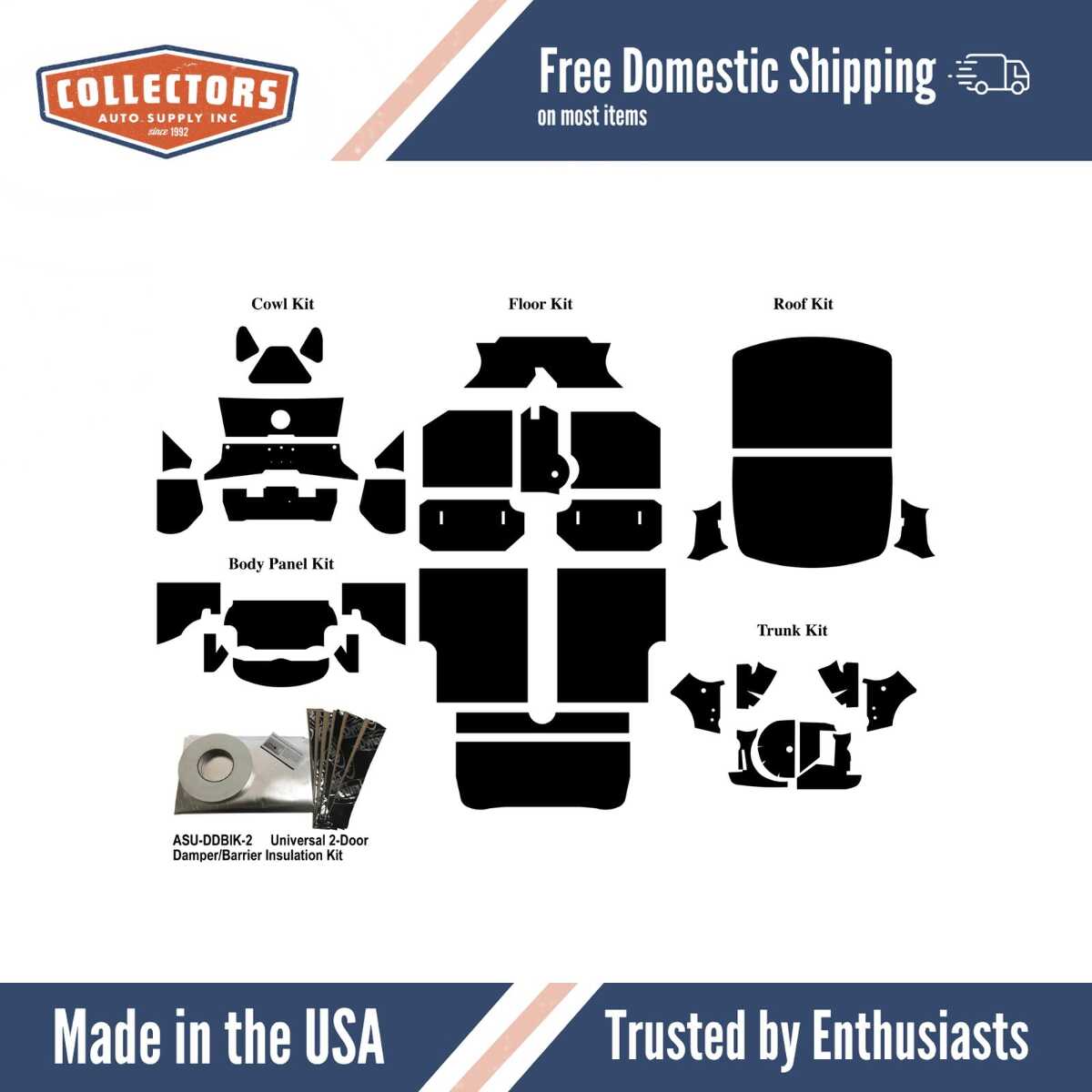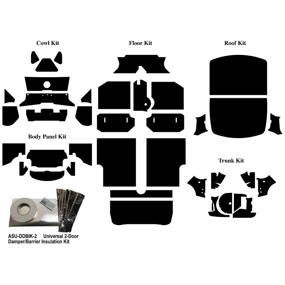 The kit includes floor insulation, trunk insulation, body panel insulation, cowl/firewall insulation, roof insulation, and two door damper/barrier shields.