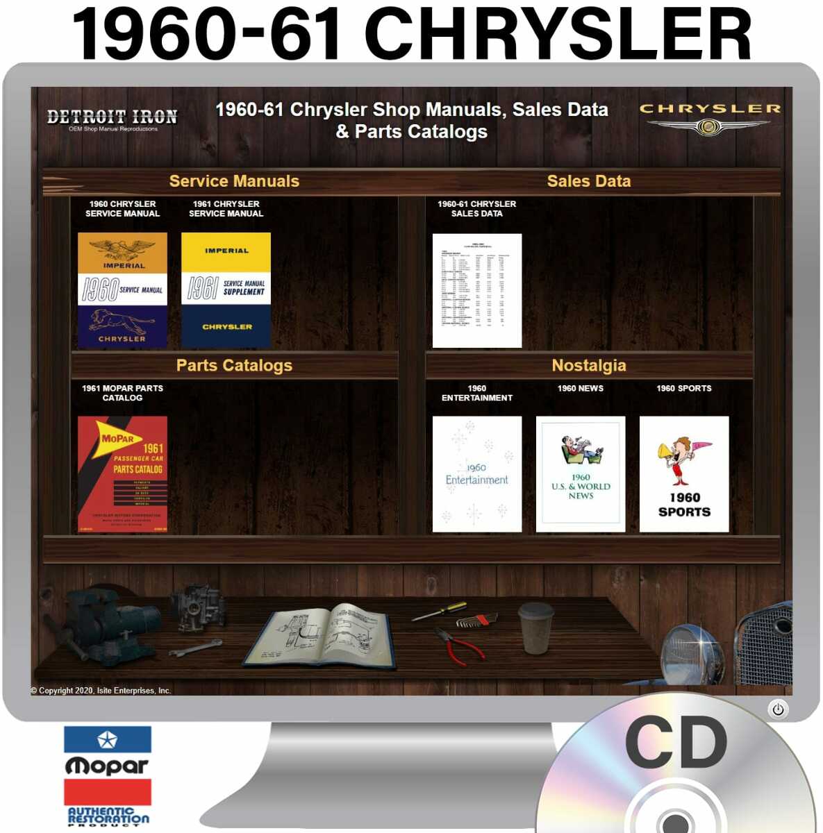 The 1960-1961 Chrysler Shop Manuals, Sales Data and Parts Book on CD is a digital product licensed by Chrysler. This digital product provides a full set of original equipment manufacturer (OEM) repair and rebuild literature in digital PDF format. This set of manuals and literature were originally authored and published by the car / truck manufacturer to be used by their dealership mechanics so they are very comprehensive. It features an easy-to-use bookcase in a garage scene containing a set of PDF manuals, catalogs, brochures and nostalgia for a specific year, make and model range. Features: - Each manual is chapter bookmarked into a single PDF file, allowing for ease of searching - Files are printable and searchable - The bookcase provides organization of manual types (Service Manuals, Sales Literature, Parts Catalogs & Nostalgia). Refer below for specific details included in the 1960-1961 Chrysler Shop Manuals, Sales Data and Parts Book Detroit Iron CD product. MANUALS INCLUDED: - 1960?Chrysler/Imperial?Shop Manual - 1961Chrysler/Imperial?Shop Manual Supplement - 1961 Mopar Parts Catalog - 1960-61 Chrysler Sales Data 1960 - 1961 Chrysler Models Covered: Windsor, New Yorker, Newport, Saratoga, Imperial, 300, Town & Country This digital product includes OEM / factory service / shop manuals and parts guides / books. Each factory service/shop manual provides detailed step-by-step service instructions with associated exploded views and photos for all vehicle components. An OEM Parts Guide or Parts Book provides detailed parts information via exploding diagram cutouts of sections of your vehicle assembly with part numbers and textual descriptions. A parts guide provides part interchange information so you can find replacement parts. SYSTEM REQUIREMENTS: Any Operating System (OS) that allows user access to the file system, e.g. Windows, Mac OS, Linux, Chromebook, etc. An HTML Browser such as: Edge, Explorer, Chrome, Safari, Firefox and others. NOTE: No internet connection is required to use this product.