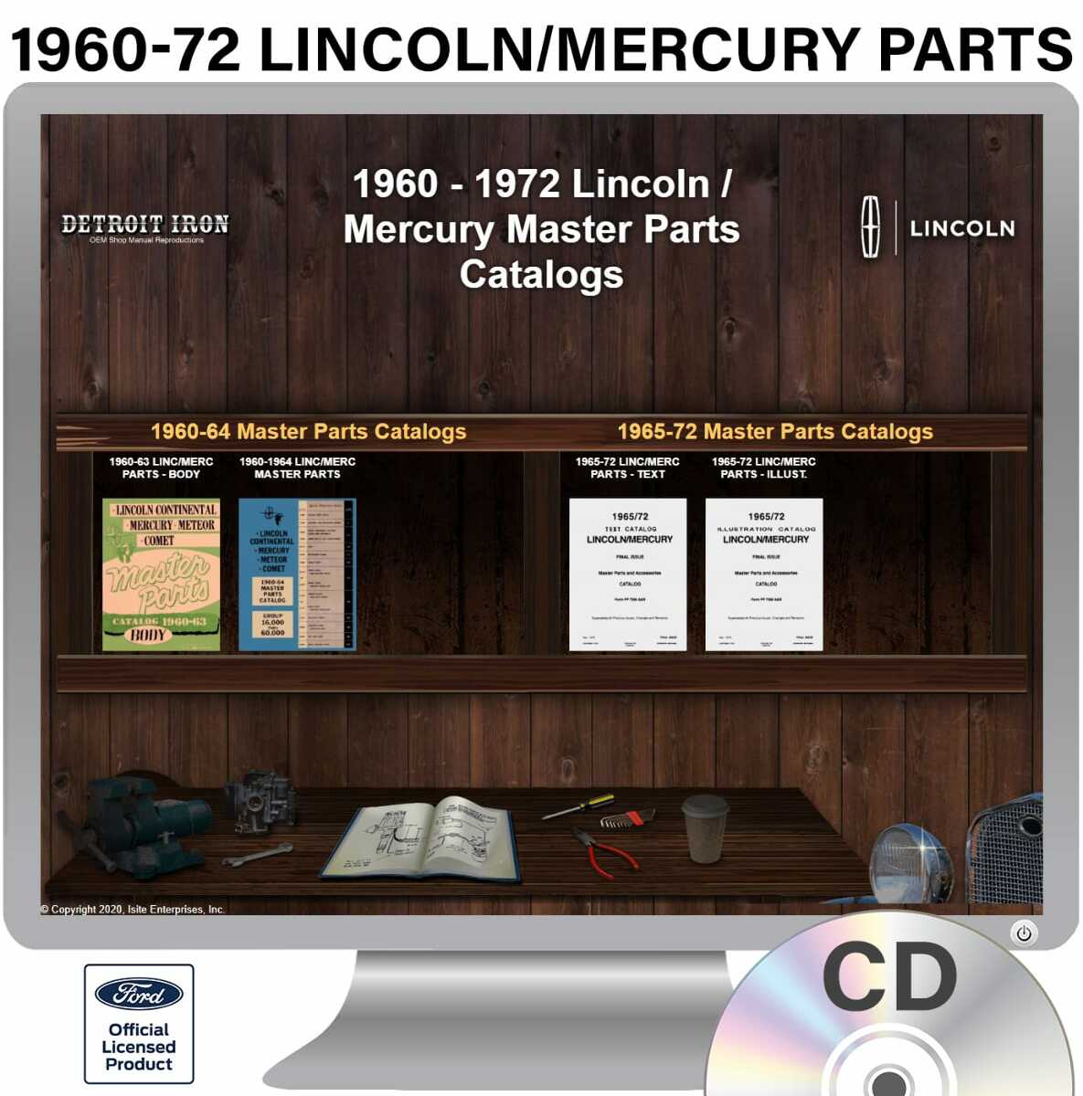 The 1960-1972 Lincoln / Mercury Parts Manuals (Only) on CD is a digital product licensed by Ford. This digital product provides a full set of original equipment manufacturer (OEM) repair and rebuild literature in digital PDF format. This set of manuals and literature were originally authored and published by the car / truck manufacturer to be used by their dealership mechanics so they are very comprehensive. It features an easy-to-use bookcase in a garage scene containing a set of PDF manuals, catalogs, brochures and nostalgia for a specific year, make and model range. Features: - Each manual is chapter bookmarked into a single PDF file, allowing for ease of searching - Files are printable and searchable - The bookcase provides organization of manual types (Service Manuals, Sales Literature, Parts Catalogs & Nostalgia). Refer below for specific details included in the 1960-1972 Lincoln / Mercury Parts Manuals (Only) Detroit Iron CD product. MANUALS INCLUDED: - 1960-1963 Lincoln Mercury Body Parts Book - 1960-1963 Lincoln Mercury Body Master Parts Catalog - 1965-1972 Lincoln/Mercury Parts - Illustrated - 1965-1972 Lincoln / Mercury Parts - Text? 1960 - 1972 Lincoln, Mercury, Ford Models Covered: Continental, Lincoln Series, Premier, Colony Park, Comet, Commuter, Country Cruiser, Montclair, Monterey, Park Lane, Meteor, Capri, Villager, Marauder, Caliente, Cyclone, Voyager, Brougham, Cougar, Marquis, Mark III, Montego, Mark IV An OEM Parts Guide or Parts Book provides detailed parts information via exploding diagram cutouts of sections of your vehicle assembly with part numbers and textual descriptions. A parts guide provides part interchange information so you can find replacement parts. SYSTEM REQUIREMENTS: Any Operating System (OS) that allows user access to the file system, e.g. Windows, Mac OS, Linux, Chromebook, etc. An HTML Browser such as: Edge, Explorer, Chrome, Safari, Firefox and others. NOTE: No internet connection is required to use this product.
