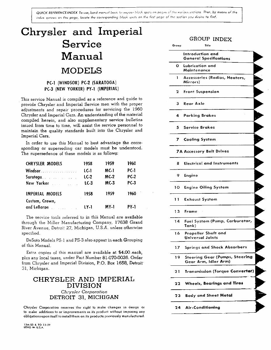 This Repair Manual is specifically designed to fit 1960 Chrysler Windsor vehicles with a Car body style.