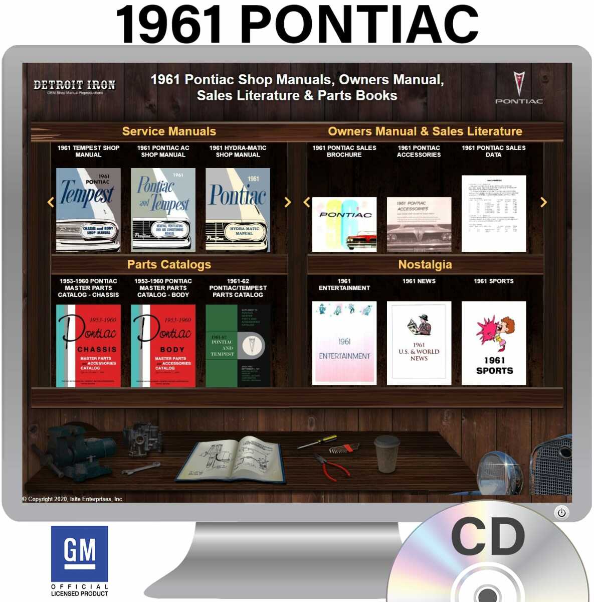 The 1961 Pontiac Shop Manuals, Owner Manual, Sales Literature & Parts Books on CD is a digital product licensed by GM. This digital product provides a full set of original equipment manufacturer (OEM) repair and rebuild literature in PDF format. This set of manuals and literature were originally authored and published by the car / truck manufacturer to be used by their dealership mechanics so they are very comprehensive. It features an easy-to-use bookcase in a garage scene containing a set of PDF manuals, catalogs, brochures and nostalgia for a specific year, make and model range. Features: - Each manual is chapter bookmarked into a single PDF file, allowing for ease of searching - Files are printable and searchable - The bookcase provides organization of manual types (Service Manuals, Sales Literature, Parts Catalogs & Nostalgia). Refer below for specific details included in this Detroit Iron CD product. MANUALS INCLUDED: - 1961 Pontiac Chassis Shop Manual - 1961 Pontiac Tempest Chassis & Body Shop Manual - 1961 Pontiac Body Service Manual - 1961 Pontiac Hydra-Matic Manual - 1961 Pontiac Heating & A/C Manual - 1953-60 Pontiac Parts Books - 1961-62 Pontiac/Tempest Master Parts and Accessories Catalog - 1961 Owners Manual - 1961 Pontiac Sales Brochures and Data 1961 Pontiac Models Covered: Bonneville, Catalina, Star Chief, Tempest, Ventura This digital product includes OEM / factory service / shop manuals and parts guides / books. Each factory service/shop manual provides detailed step-by-step service instructions with associated exploded views and photos for all vehicle components. An OEM Parts Guide or Parts Book provides detailed parts information via exploding diagram cutouts of sections of your vehicle assembly with part numbers and textual descriptions. A parts guide provides part interchange information so you can find replacement parts. SYSTEM REQUIREMENTS: Any Operating System (OS) that allows user access to the file system, e.g. Windows, Mac OS, Linux, Chromebook, etc. An HTML Browser such as: Edge, Explorer, Chrome, Safari, Firefox and others. NOTE: No internet connection is required to use this product.