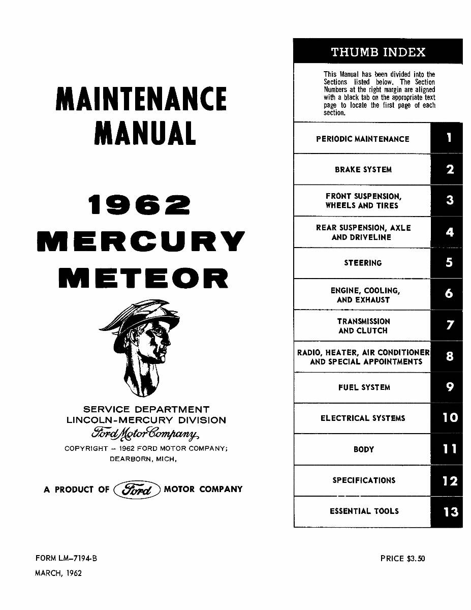 This Repair Manual is specifically designed to fit 1962 Mercury Meteor vehicles with a Car body style.