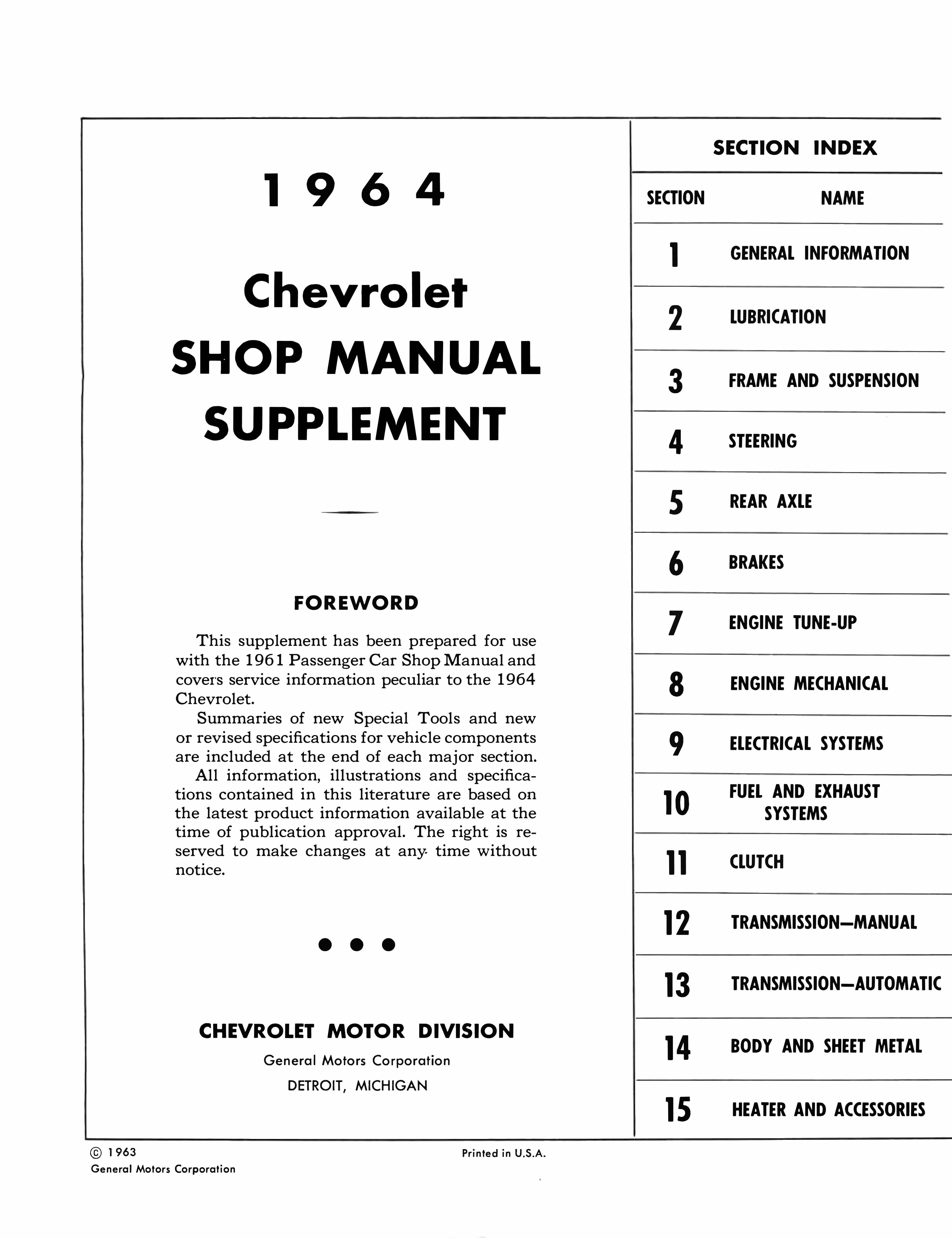 This Repair Manual is printed here in the United States, designed to duplicate the original print with better image and text quality than that of the originals for the 1964 Chevrolet Bel Air vehicles.
