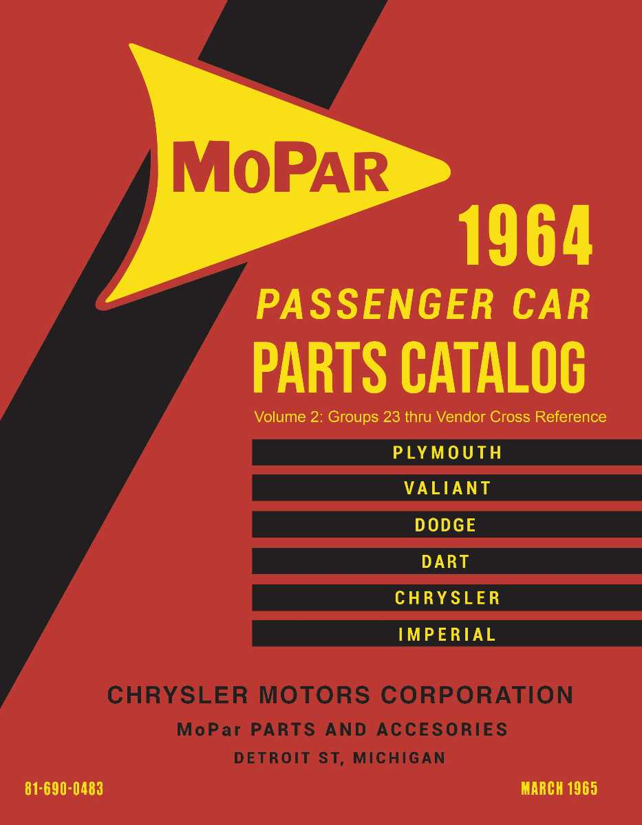 This 1964 Mopar Parts Parts Catalog is a high-quality, licensed PRINT reproduction of the parts catalog authored by Chrysler Corporation. It contains 1344 pages of detailed parts information via exploded diagram cutouts of sections of your vehicle assembly with parts numbers and textual descriptions. A parts guide provides part interchange information so you can find replacement parts. The part book sections usually include: suspension, engine, transmission, body fittings/parts, brakes, cooling / radiator, exhaust, fenders, doors, fuel system, etc. The following 1964 Chrysler, Dodge, Plymouth models are covered: New Yorker, Newport, Imperial, 300, Town & Country, 880, 330, 440, Dart, Polara, Barracuda, Belvedere, Fury, Savoy, Valiant. This factory written shop manual is perfect for the restorer or anyone working on one of these vehicles.