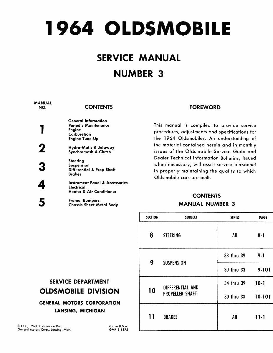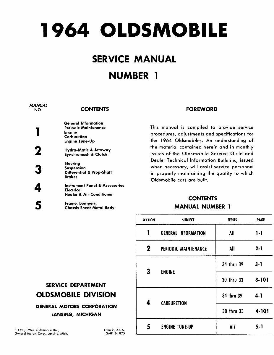 This Repair Manual is printed here in the United States, designed to duplicate the original print with better image and text quality than that of the originals for the 1964 Oldsmobile 442 vehicles.
