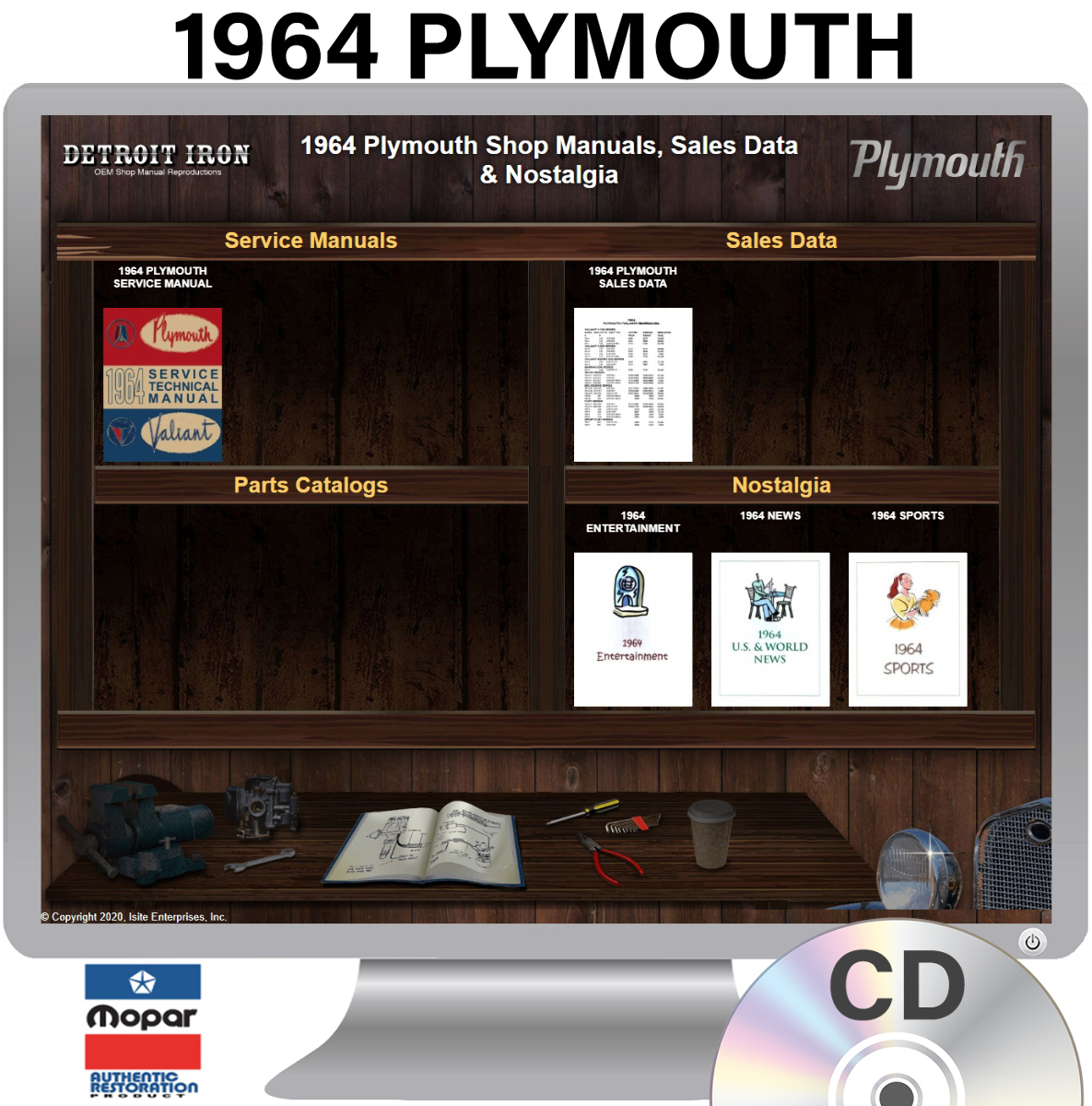 The 1964 Plymouth Shop Manual & Sales Data on CD is a digital product licensed by Chrysler. This digital product provides a full set of original equipment manufacturer (OEM) repair and rebuild literature in digital PDF format. This set of manuals and literature were originally authored and published by the car / truck manufacturer to be used by their dealership mechanics so they are very comprehensive. It features an easy-to-use bookcase in a garage scene containing a set of PDF manuals, catalogs, brochures and nostalgia for a specific year, make and model range. Features: - Each manual is chapter bookmarked into a single PDF file, allowing for ease of searching - Files are printable and searchable - The bookcase provides organization of manual types (Service Manuals, Sales Literature, Parts Catalogs & Nostalgia). Refer below for specific details included in the 1964 Plymouth Shop Manual & Sales Data Detroit Iron CD product. MANUALS INCLUDED: - 1964 Plymouth Shop Manual - 1964 Plymouth Sales Data 1964 Plymouth Models Covered: Belvedere, Fury, Savoy, Valiant Each factory service/shop manual provides detailed step-by-step service instructions with associated exploded views and photos for all vehicle components. SYSTEM REQUIREMENTS: Any Operating System (OS) that allows user access to the file system, e.g. Windows, Mac OS, Linux, Chromebook, etc. An HTML Browser such as: Edge, Explorer, Chrome, Safari, Firefox and others. NOTE: No internet connection is required to use this product.