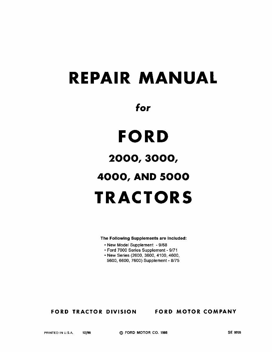 This 1965 - 1972 Ford Tractor Service Manual Series 2000-7000 is a high-quality, licensed PRINT reproduction of the service manual authored by Ford Motor Company. This OEM factory manual is 8.5 x 11 inches, paperback bound, shrink-wrapped and contains 1076 pages of comprehensive mechanical instructions with detailed diagrams, photos and specifications for the mechanical components of your vehicle such as the engine, transmission, suspension, brakes, fuel, exhaust, steering, electrical and drive line. Service / repair manuals were originally written by the automotive manufacturer to be used by their dealership mechanics. The following 1965-1975 Ford models are covered: 2000, 2600, 3000, 3500, 3600, 4000, 4100, 4400, 4500, 4600, 5000, 5500, 5550, 5600, 6600, 7000, 7600. This factory written shop manual is perfect for the restorer or anyone working on one of these vehicles.