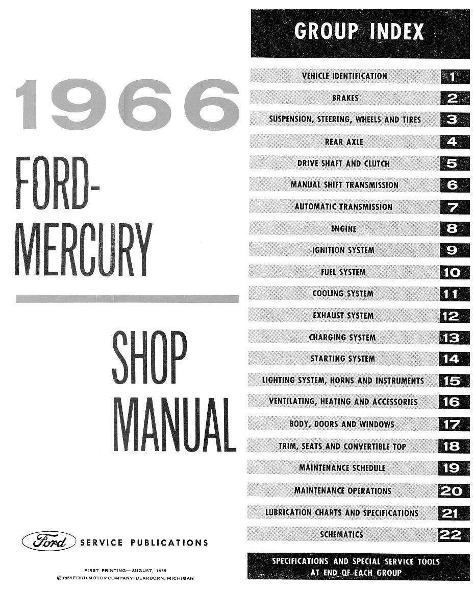 This Repair Manual is printed here in the United States, designed to duplicate the original print with better image and text quality than that of the originals for the 1966 Ford, Mercury Multiple Models vehicles.