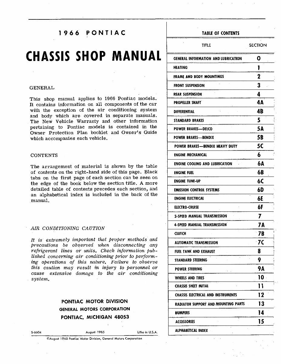 This Repair Manual is printed here in the United States, designed to duplicate the original print with better image and text quality than that of the originals for the 1966 Pontiac Bonneville vehicles.