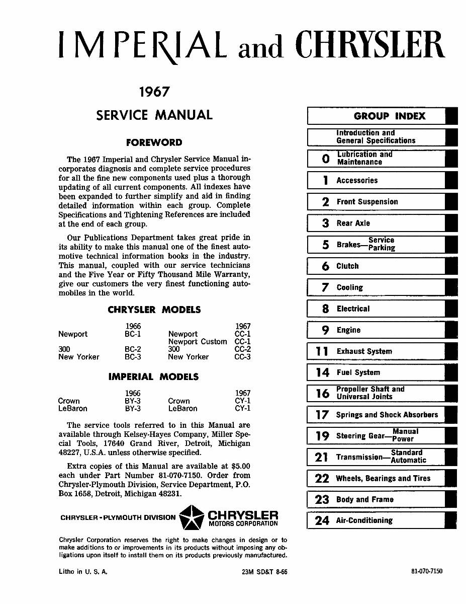 This Repair Manual is specifically designed to fit 1967 Chrysler 300 vehicles with a Car body style.