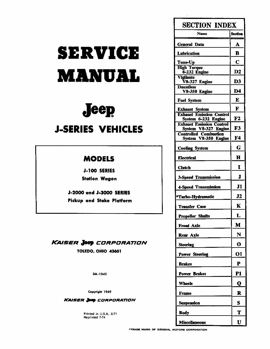 This 1969 - 1970 Jeep Gladiator & Wagoneer (J-Series) Service Manual is a high-quality, licensed PRINT reproduction of the service manual authored by Jeep Corporation. This OEM factory manual is 8.5 x 11 inches, paperback bound, shrink-wrapped and contains 584 pages of comprehensive mechanical instructions with detailed diagrams, photos and specifications for the mechanical components of your vehicle such as the engine, transmission, suspension, brakes, fuel, exhaust, steering, electrical and drive line. Service / repair manuals were originally written by the automotive manufacturer to be used by their dealership mechanics. The following 1969-1970 Jeep models are covered: Gladiator, J-100, J-2500, J-2600, J-2700, J-3500, J-3600, J-3700, J-3800, Wagoneer. This factory written shop manual is perfect for the restorer or anyone working on one of these vehicles.