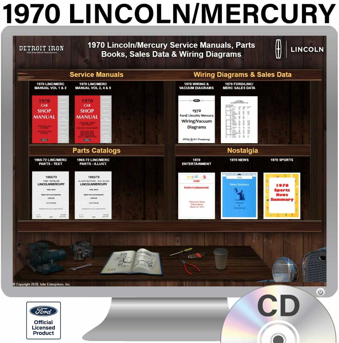 The 1970 Lincoln Mercury Shop Manuals, Wiring Diagrams, Sales Data & Parts Books on CD is a digital product licensed by Ford. This digital product provides a full set of original equipment manufacturer (OEM) repair and rebuild literature in digital PDF format. This set of manuals and literature were originally authored and published by the car / truck manufacturer to be used by their dealership mechanics so they are very comprehensive. It features an easy-to-use bookcase in a garage scene containing a set of PDF manuals, catalogs, brochures and nostalgia for a specific year, make and model range. Features: - Each manual is chapter bookmarked into a single PDF file, allowing for ease of searching - Files are printable and searchable - The bookcase provides organization of manual types (Service Manuals, Sales Literature, Parts Catalogs & Nostalgia). Refer below for specific details included in the 1970 Lincoln Mercury Shop Manuals, Wiring Diagrams, Sales Data & Parts Books Detroit Iron CD product. MANUALS INCLUDED: - 1970 Lincoln / Ford / Mercury Shop Manual (5 Vols) - 1970 Lincoln / Mercury Wiring Diagrams - 1965-1972 Lincoln/Mercury Parts - Illustrated - 1965-1972 Lincoln / Mercury Parts - Text 1970 Lincoln, Mercury Models Covered: Continental, Mark III, Colony Park, Cougar, Cyclone, Marauder, Marquis, Montego, Monterey This digital product includes OEM / factory service / shop manuals and parts guides / books. Each factory service/shop manual provides detailed step-by-step service instructions with associated exploded views and photos for all vehicle components. An OEM Parts Guide or Parts Book provides detailed parts information via exploding diagram cutouts of sections of your vehicle assembly with part numbers and textual descriptions. A parts guide provides part interchange information so you can find replacement parts. SYSTEM REQUIREMENTS: Any Operating System (OS) that allows user access to the file system, e.g. Windows, Mac OS, Linux, Chromebook, etc. An HTML Browser such as: Edge, Explorer, Chrome, Safari, Firefox and others. NOTE: No internet connection is required to use this product.