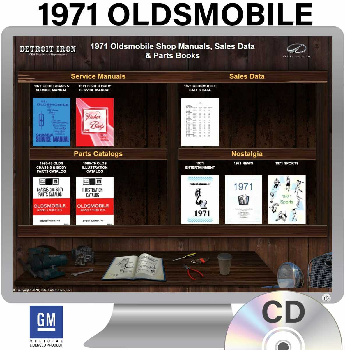 The 1971 Oldsmobile Shop Manuals, Sales Data & Parts Books on CD is a digital product licensed by GM. This digital product provides a full set of original equipment manufacturer (OEM) repair and rebuild literature in PDF format. This set of manuals and literature were originally authored and published by the car / truck manufacturer to be used by their dealership mechanics so they are very comprehensive. It features an easy-to-use bookcase in a garage scene containing a set of PDF manuals, catalogs, brochures and nostalgia for a specific year, make and model range. Features: - Each manual is chapter bookmarked into a single PDF file, allowing for ease of searching - Files are printable and searchable - The bookcase provides organization of manual types (Service Manuals, Sales Literature, Parts Catalogs & Nostalgia). Refer below for specific details included in the 1971 Oldsmobile Shop Manuals, Sales Data & Parts Books Detroit Iron CD product. MANUALS INCLUDED: - 1971 Oldsmobile Chassis Service Manual (F-85/Vista Cruiser/Cutlass/442/Delta Custom/Delta 88/98/Toronado) - 1971 Fisher Body Service Manual - 1965-1975 Oldsmobile Chassis and Body Parts Catalog - Text (Models Thru 1975) - 1965-1975 Oldsmobile Parts Illustration Catalog (Models Thru 1975) - 1971 Oldsmobile Sales Data 1971 Oldsmobile Models Covered: 442, 98, Custom Cruiser, Cutlass, Cutlass Supreme, Delta 88, F85, Toronado, Vista Cruiser This digital product includes OEM / factory service / shop manuals and parts guides / books. Each factory service/shop manual provides detailed step-by-step service instructions with associated exploded views and photos for all vehicle components. An OEM Parts Guide or Parts Book provides detailed parts information via exploding diagram cutouts of sections of your vehicle assembly with part numbers and textual descriptions. A parts guide provides part interchange information so you can find replacement parts. SYSTEM REQUIREMENTS: Any Operating System (OS) that allows user access to the file system, e.g. Windows, Mac OS, Linux, Chromebook, etc. An HTML Browser such as: Edge, Explorer, Chrome, Safari, Firefox and others. NOTE: No internet connection is required to use this product.