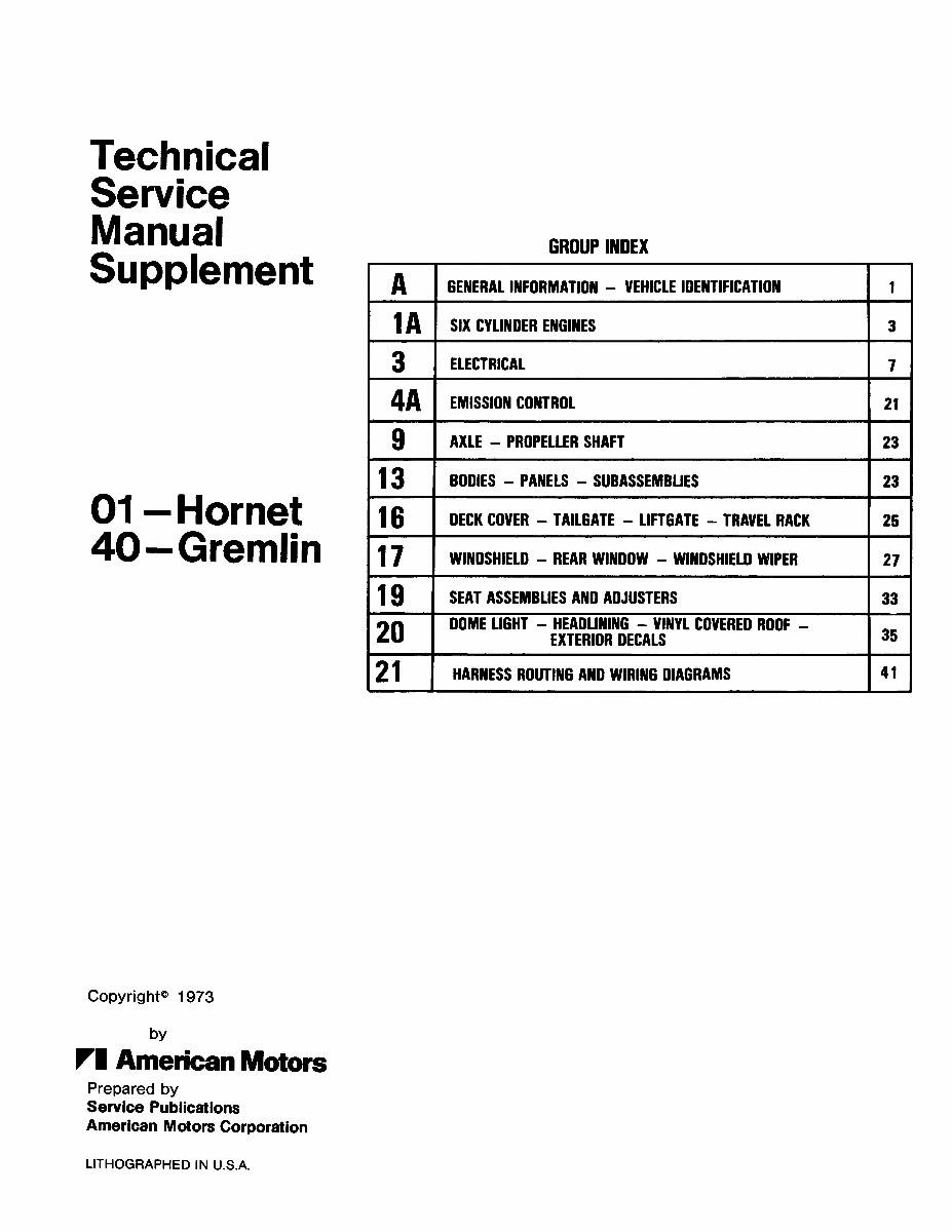 This Repair Manual is printed here in the United States, designed to duplicate the original print with better image and text quality than that of the originals for the 1973 American Motors vehicles.