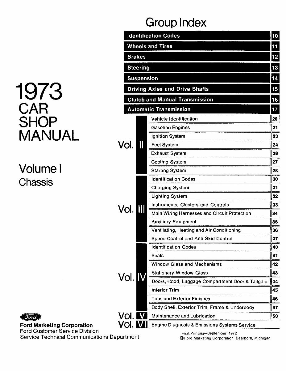 This Repair Manual is printed here in the United States, designed to duplicate the original print with better image and text quality than that of the originals for the 1973 Ford, Lincoln, Mercury Multiple Models vehicles.