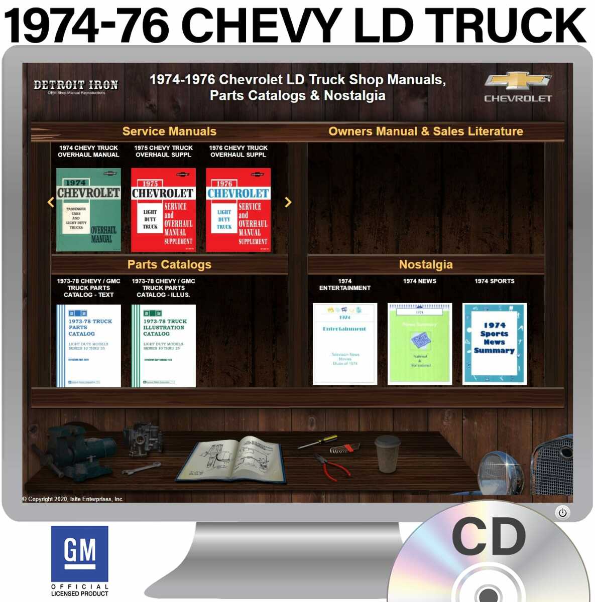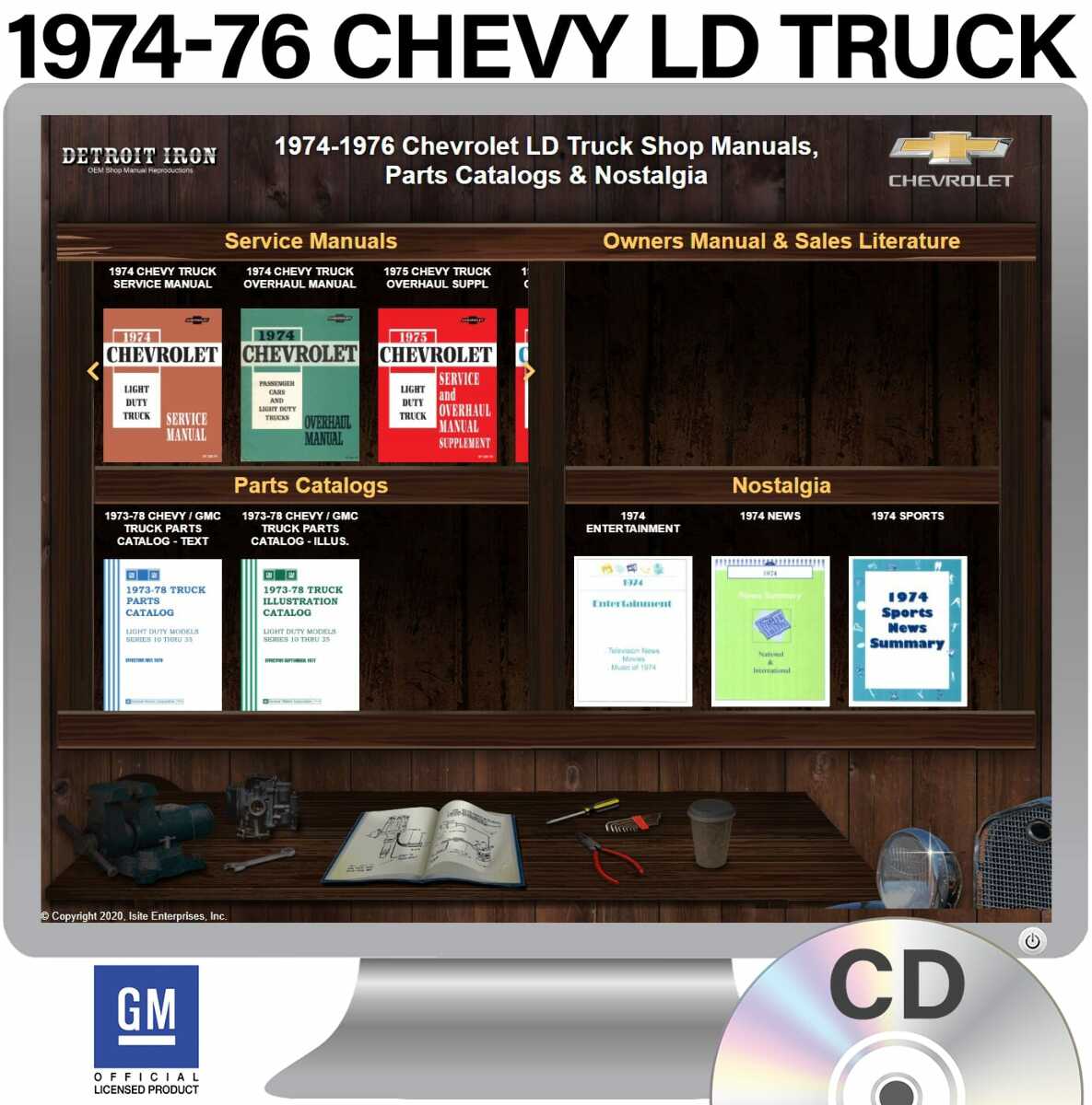 The 1974-1976 Chevrolet Trucks Light Duty Shop Manuals & Parts Books on CD is a digital product licensed by GM. This digital product provides a full set of original equipment manufacturer (OEM) repair and rebuild literature in digital PDF format. This set of manuals and literature were originally authored by the car / truck manufacturer to be used by their dealership mechanics so they are very comprehensive. Features: - Each manual is chapter bookmarked into a single PDF file, allowing for ease of searching - Files are printable and searchable - The bookcase provides organization of manual types. Refer below for specific details included in this Detroit Iron CD product. MANUALS INCLUDED: - 1974 Chevrolet Truck Service Manual - 1974 Chevrolet Cars Trucks Overhaul Manual - 1975 Chevrolet Truck Service / Overhaul Manual Supplement - 1975 ChevroletTruck Overhaul Manual Supplement - 1976 Chevrolet Truck Service / Overhaul Manual Supplement - 1976 Chevrolet Truck Overhaul Manual Supplement - 1973-78 Truck Parts Illustration Catalogs 1974 - 1976 Chevrolet Models Covered: Blazer, C10 Pickup, C10 Suburban, C20 Pickup, C20 Suburban, C30 Pickup, G10 Van, G20 Van, G30 Van, K10 Pickup, K10 Suburban, K20 Pickup, K20 Suburban, K30 Pickup, P10 Van, P20 Van, P30 Van, C10, C20, C30, G10, G20, G30, K10, K20, K5 Blazer, P10, P20, P30 This digital product includes OEM / factory service / shop manuals and parts guides / books. Each factory service/shop manual provides detailed step-by-step service instructions with associated exploded views and photos for all vehicle components. An OEM Parts Guide or Parts Book provides detailed parts information via exploding diagram cutouts of sections of your vehicle assembly with part numbers and textual descriptions. SYSTEM REQUIREMENTS: Any Operating System (OS) that allows user access to the file system, e.g. Windows, Mac OS, Linux, Chromebook, etc. An HTML Browser such as: Edge, Explorer, Chrome, Safari, Firefox and others. NOTE: No internet connection is required to use this product.