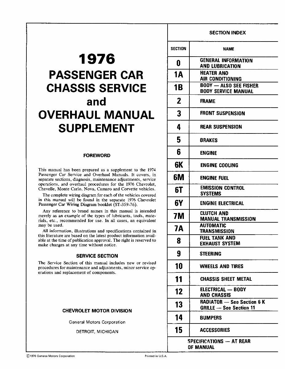 This Repair Manual is printed here in the United States, designed to duplicate the original print with better image and text quality than that of the originals for the 1976 Chevrolet Camaro vehicles.