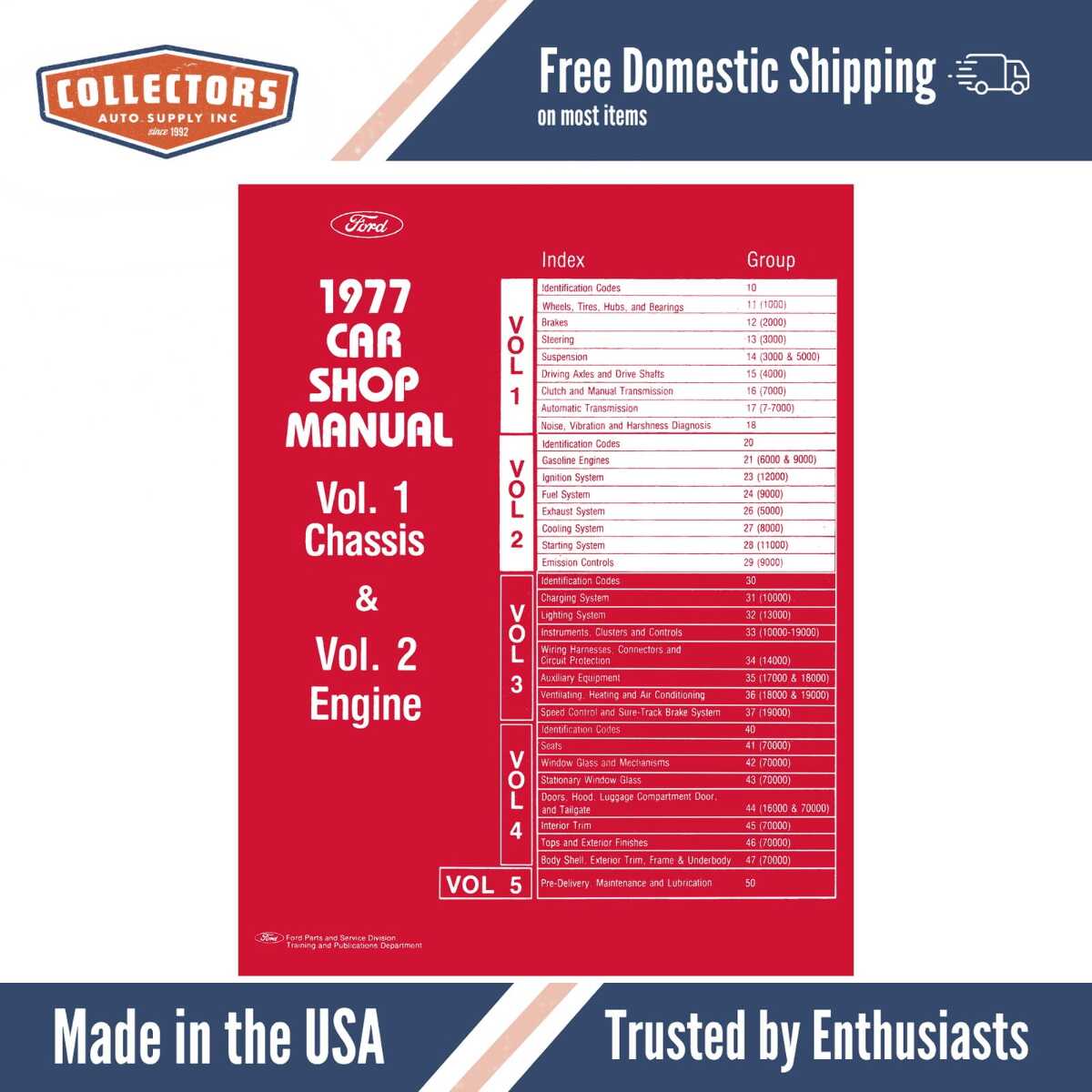 This Repair Manual is printed here in the United States, designed to duplicate the original print with better image and text quality than that of the originals for the 1977 Ford, Lincoln, Mercury Multiple Models vehicles.