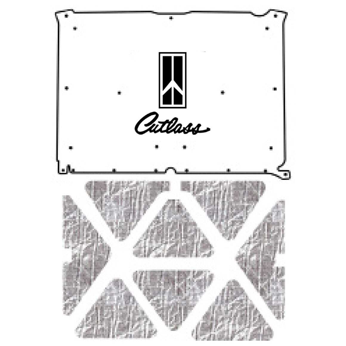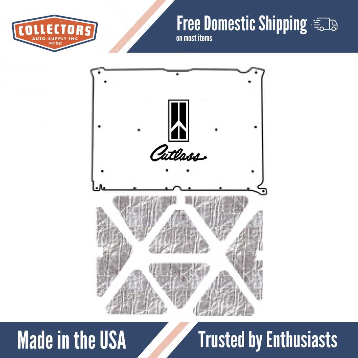 Enhance your 1978-80 Oldsmobile Cutlass with our premium Hood Insulation Pad Heat Shield, crafted from molded black leather grain ABS plastic and foil-backed jute insulation. This Classic Hood Insulation not only provides effective heat control but also reduces noise, ensuring a comfortable ride. With the included G-034 Cutlass logo, this officially licensed GM product is a perfect fit for your restoration project.