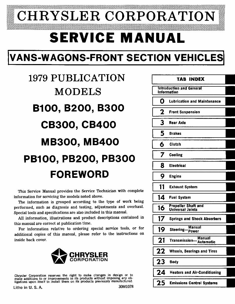 This 1979 Plymouth & Dodge Van Shop Manual is a high-quality, licensed PRINT reproduction of the service manual authored by Chrysler Corporation. This OEM factory manual is 8.5 x 11 inches, paperback bound, shrink-wrapped and contains 992 pages of comprehensive mechanical instructions with detailed diagrams, photos and specifications for the mechanical components of your vehicle such as the engine, transmission, suspension, brakes, fuel, exhaust, steering, electrical and drive line. Service / repair manuals were originally written by the automotive manufacturer to be used by their dealership mechanics. The following 1979 Dodge, Plymouth models are covered: B100, B200, B300, CB300, PB100, PB200, PB300. This factory written shop manual is perfect for the restorer or anyone working on one of these vehicles.