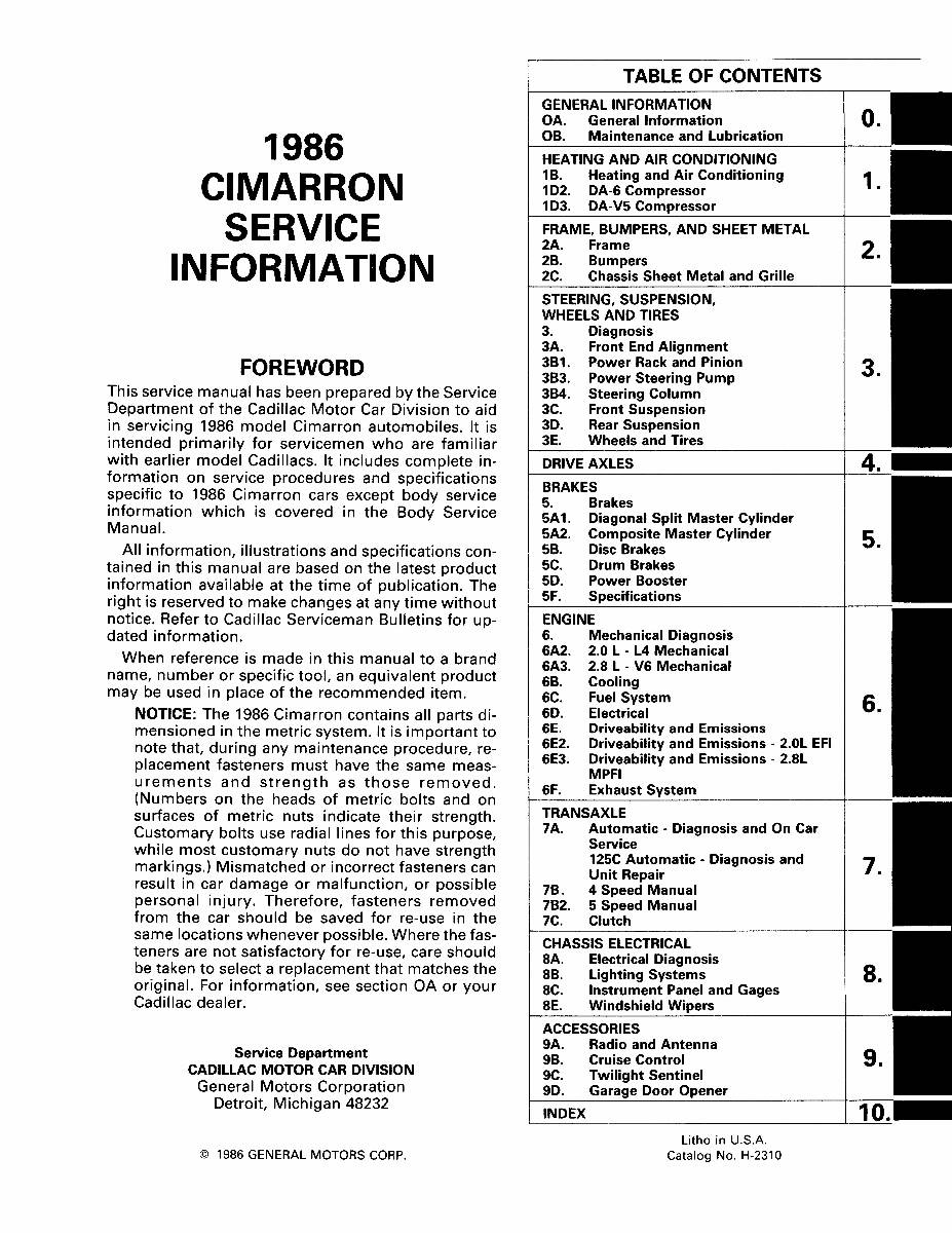 This Repair Manual is printed here in the United States, designed to duplicate the original print with better image and text quality than that of the originals for the 1986 Cadillac Cimarron vehicles.