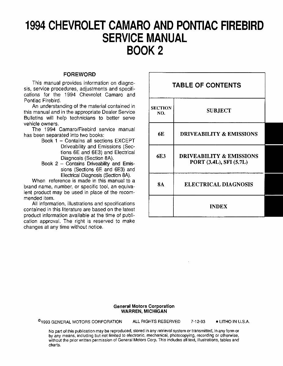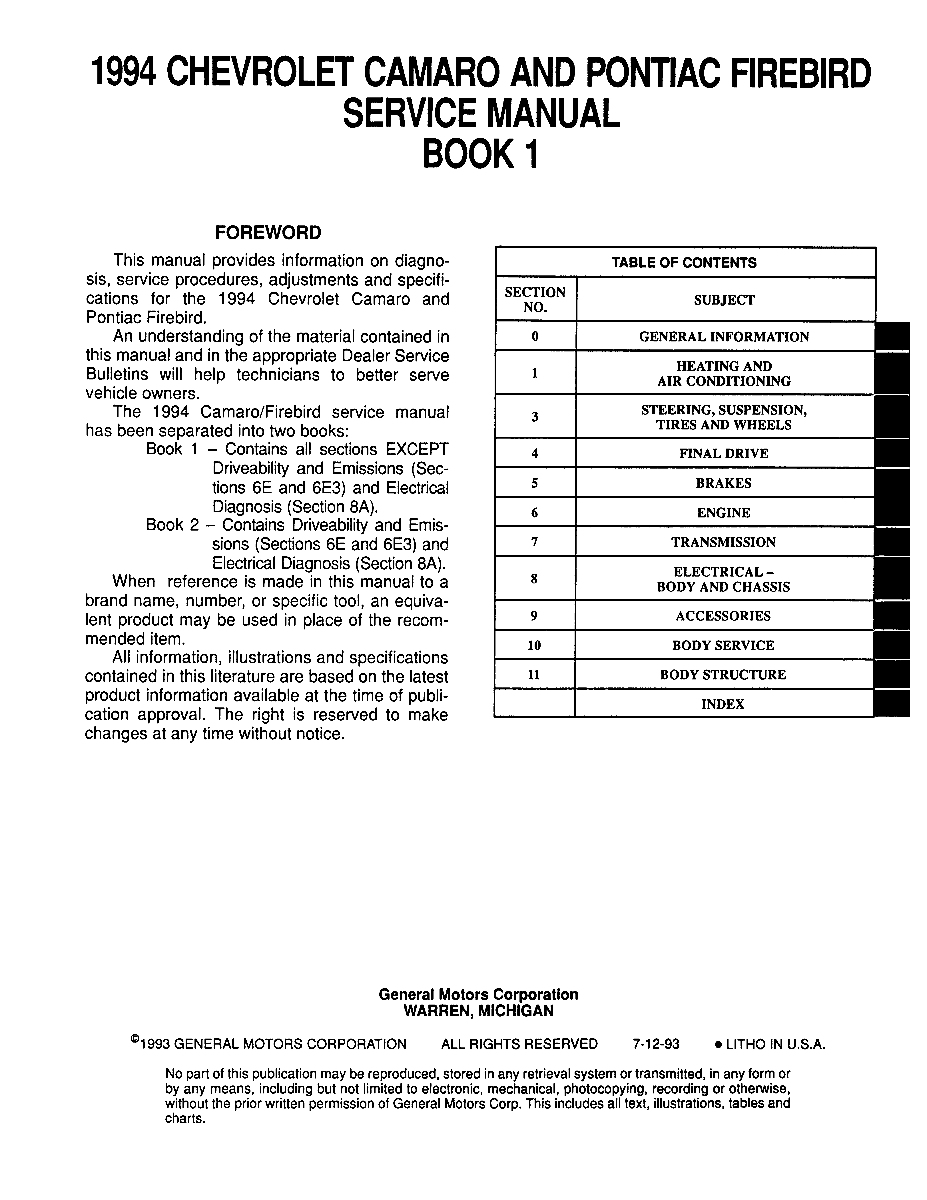 This Repair Manual is printed here in the United States, designed to duplicate the original print with better image and text quality than that of the originals for the 1994 Chevrolet, Pontiac Camaro vehicles.