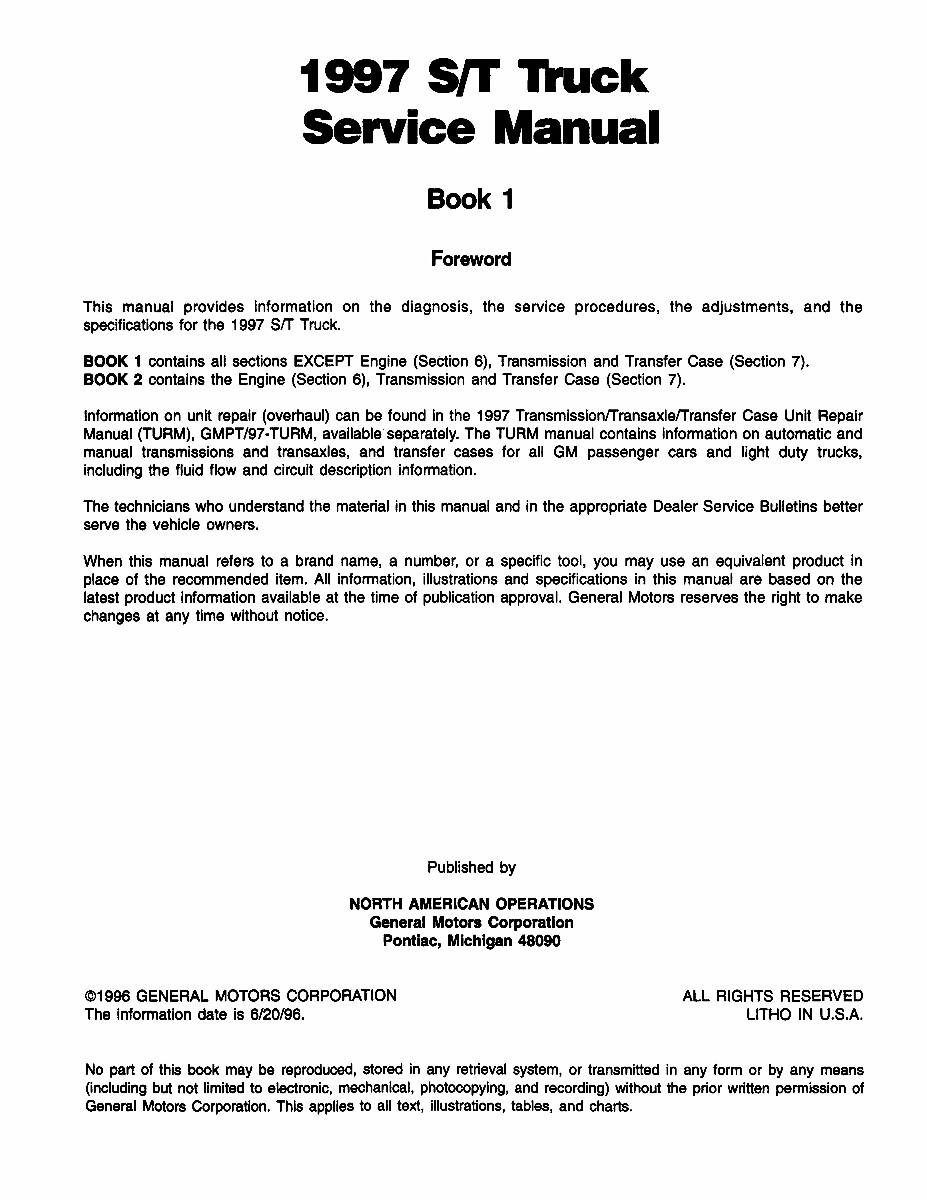 This 1997 Chevrolet & GMC S/T Truck Service Manual 2 Book Set is a high-quality, licensed PRINT reproduction of the service manual authored by General Motors Corporation. This OEM factory manual is 8.5 x 11 inches, paperback bound, shrink-wrapped and contains 3636 pages of comprehensive mechanical instructions with detailed diagrams, photos and specifications for the mechanical components of your vehicle such as the engine, transmission, suspension, brakes, fuel, exhaust, steering, electrical and drive line. Service / repair manuals were originally written by the automotive manufacturer to be used by their dealership mechanics. The following 1997 Chevrolet, GMC models are covered: S10, Blazer, Jimmy, Sonoma. This factory written shop manual is perfect for the restorer or anyone working on one of these vehicles.