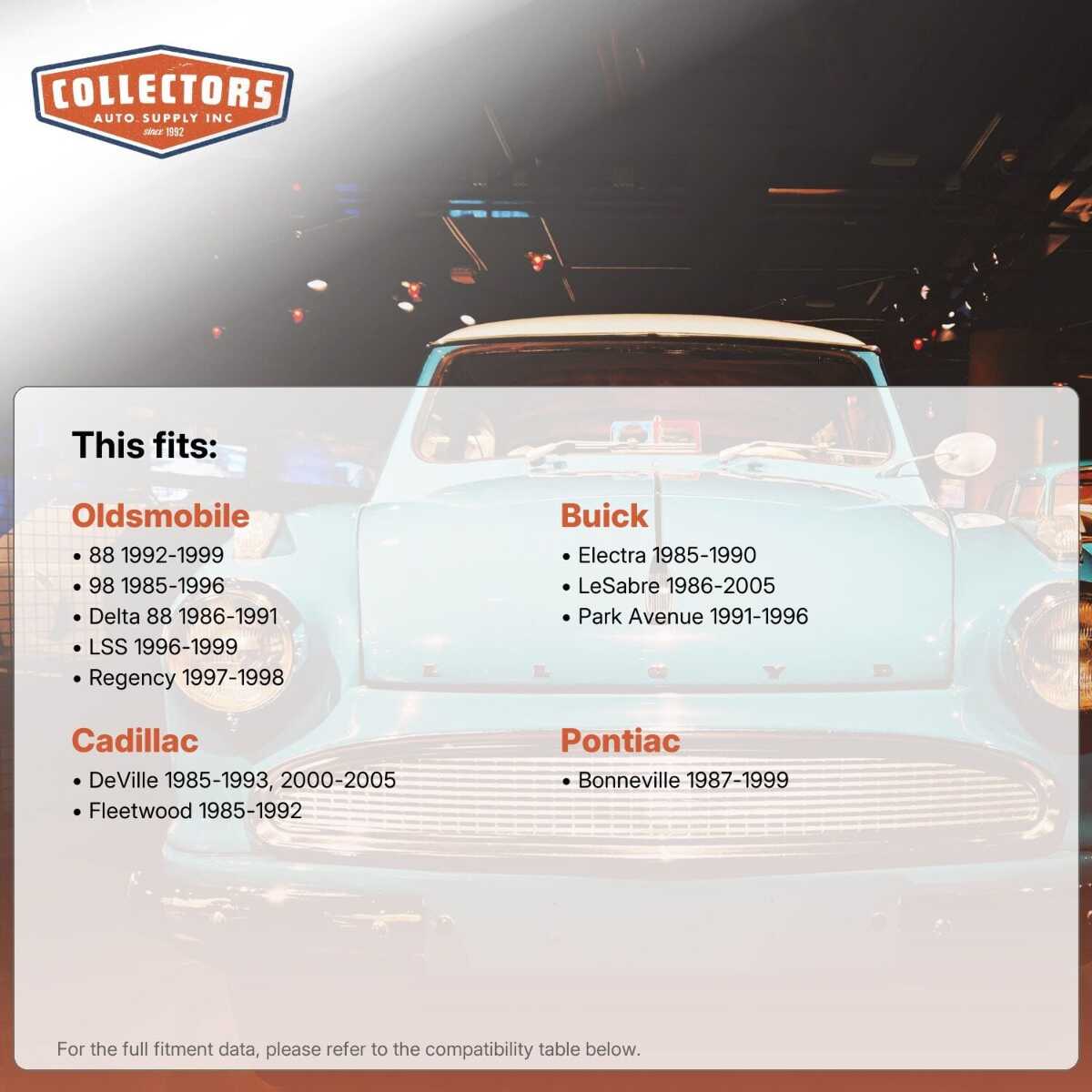 This auto part is covered by Collectors Auto Supply's three-dimensional promise — you'll get the right part the first time, you can talk to us, and with over 25 years in business and 100,000+ customer transactions, you can trust us to be the right choice to fuel your passion.
