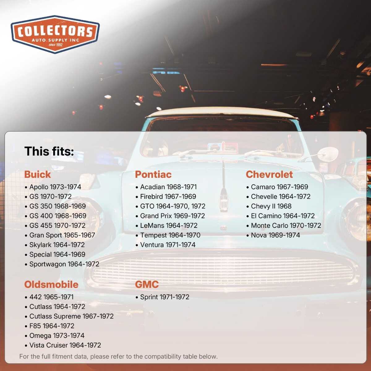 This auto part is covered by Collectors Auto Supply's three-dimensional promise — you'll get the right part the first time, you can talk to us, and with over 25 years in business and 100,000+ customer transactions, you can trust us to be the right choice to fuel your passion.