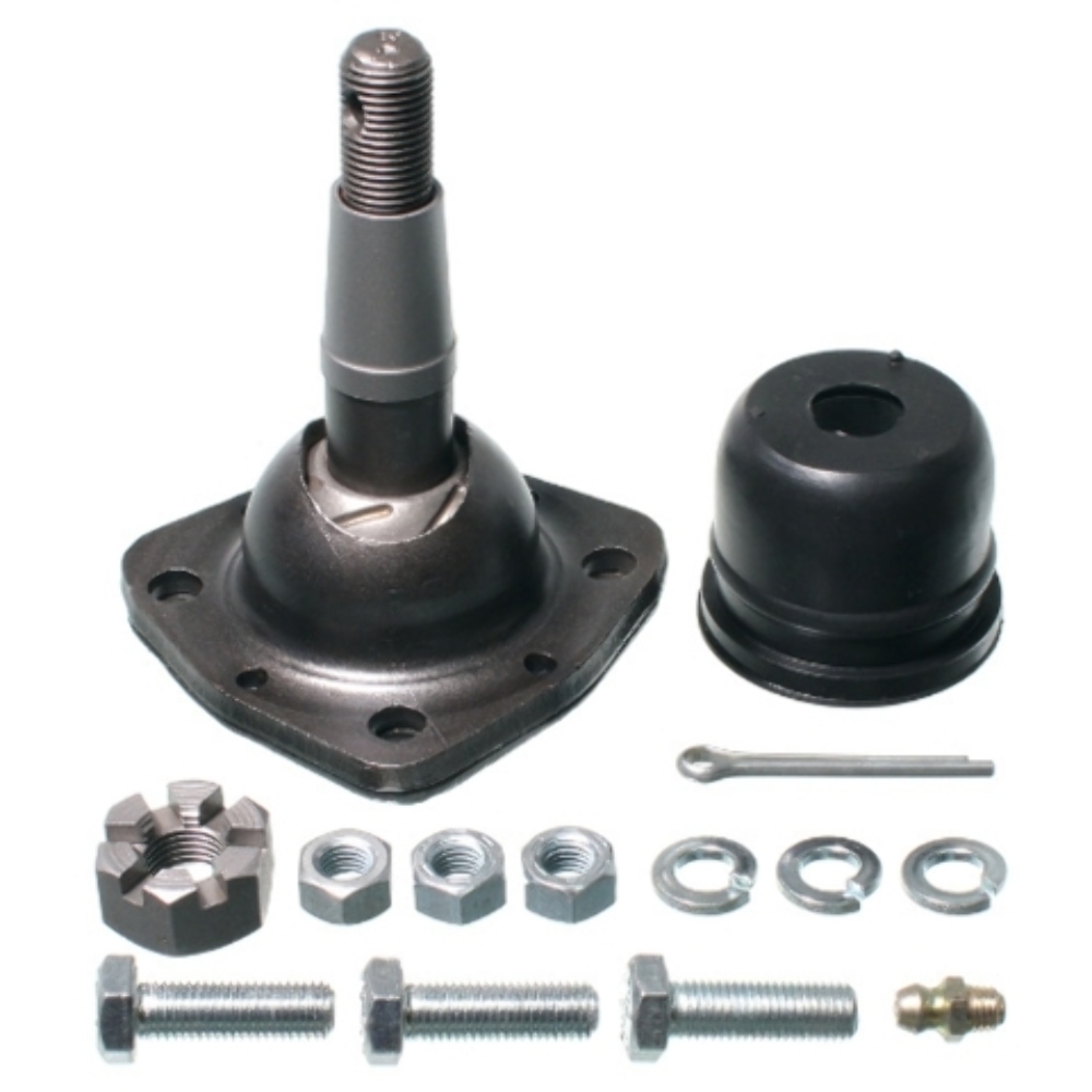 Package Contents: 1 Ball Joint, 3 Nuts, 3 Bolts, 3 Lock Washers, 1 Dust Boot, 1 Castle Nut, 1 Cotter Pin, 1 Grease Fitting
