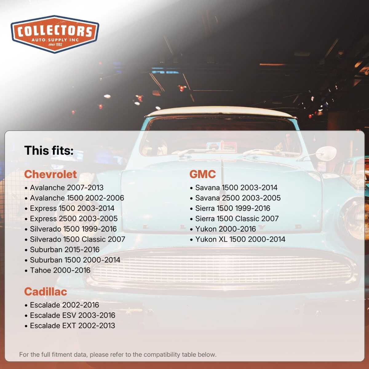 This auto part is covered by Collector's Auto Supply's three-dimensional promiseÑyou'll get the right part the first time, you can talk to us; and with over 25 years in business and 100,000+ customer transactions, you can trust us to be the right choice to fuel your passion.