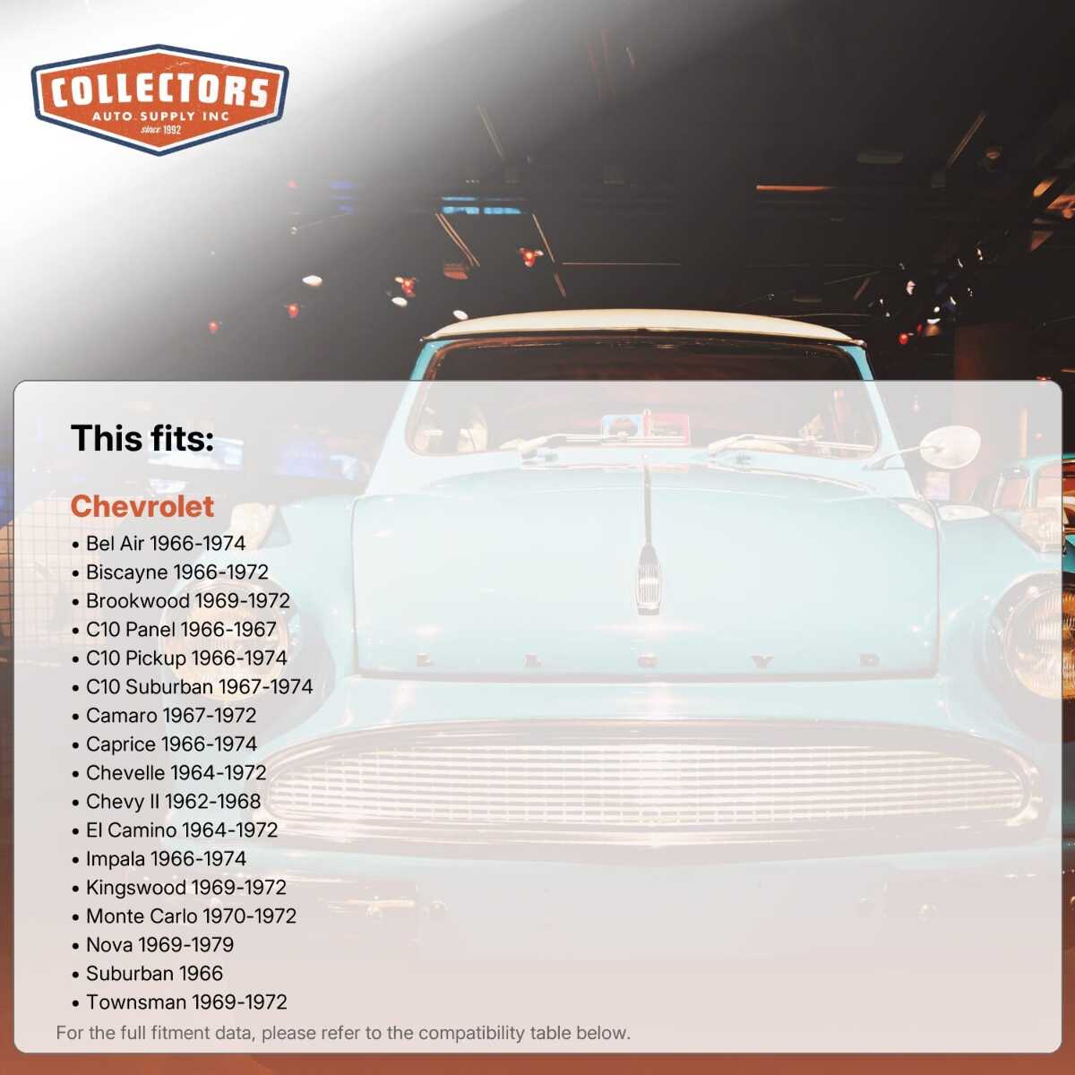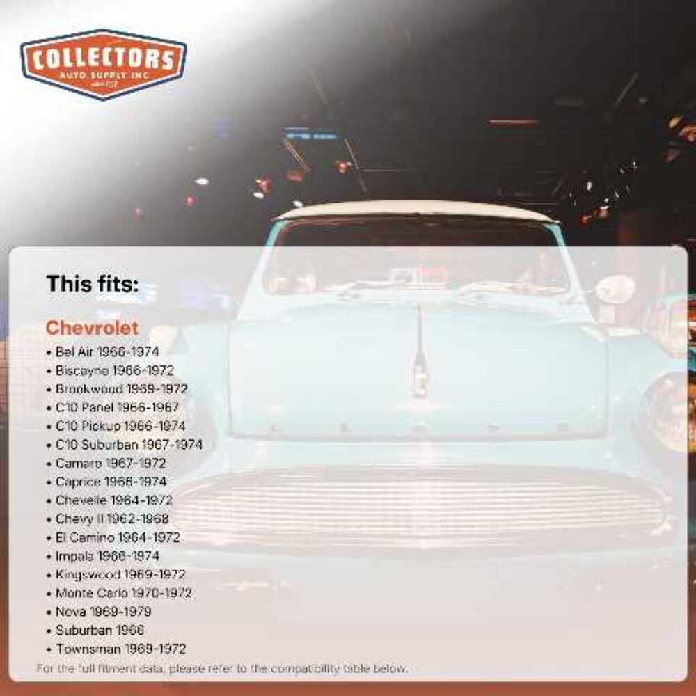 - Fitment: 1967-1972 Camaro, 1964-1972 Chevelle, 1962-1979 Nova, 1964-1972 El Camino, 1970-1972 Monte Carlo, 1966-1974 C10 Truck, 1966-74 Chevy Full Size