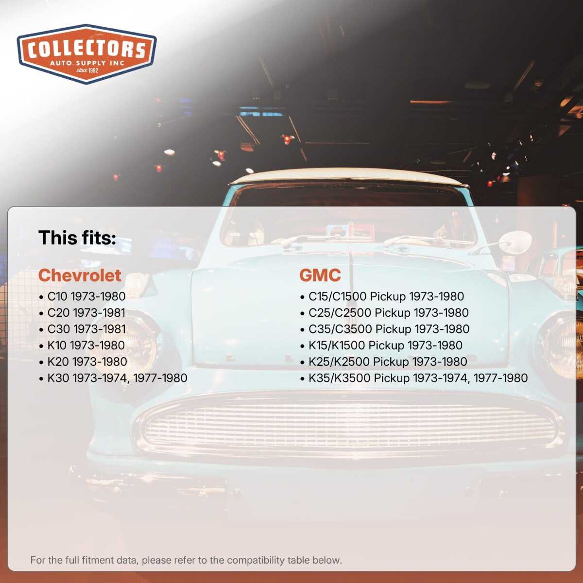 This auto part is covered by Collectors Auto Supply's three-dimensional promise — you'll get the right part the first time, you can talk to us, and with over 25 years in business and 100,000+ customer transactions, you can trust us to be the right choice to fuel your passion.