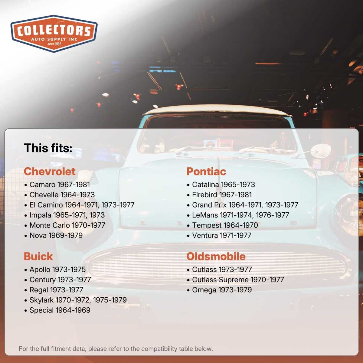 You can purchase this product directly from Collectors Auto Supply, where we specialize in classic car restoration parts and accessories. Finding the perfect part for your classic car can be difficult, and even frustrating. And let us be honest. What makes it worse is a general lack of customer love in the industry. That is why we are here, and that is why we are different. We are car people just like you, and we know what you need. And if we do not already know it, we're listening. So, contact us if you need help finding a part, or have an idea for how to improve our website, or anything else. Or if you want to do it the old-fashioned way, give us a call at 1 (800) 414-4462.