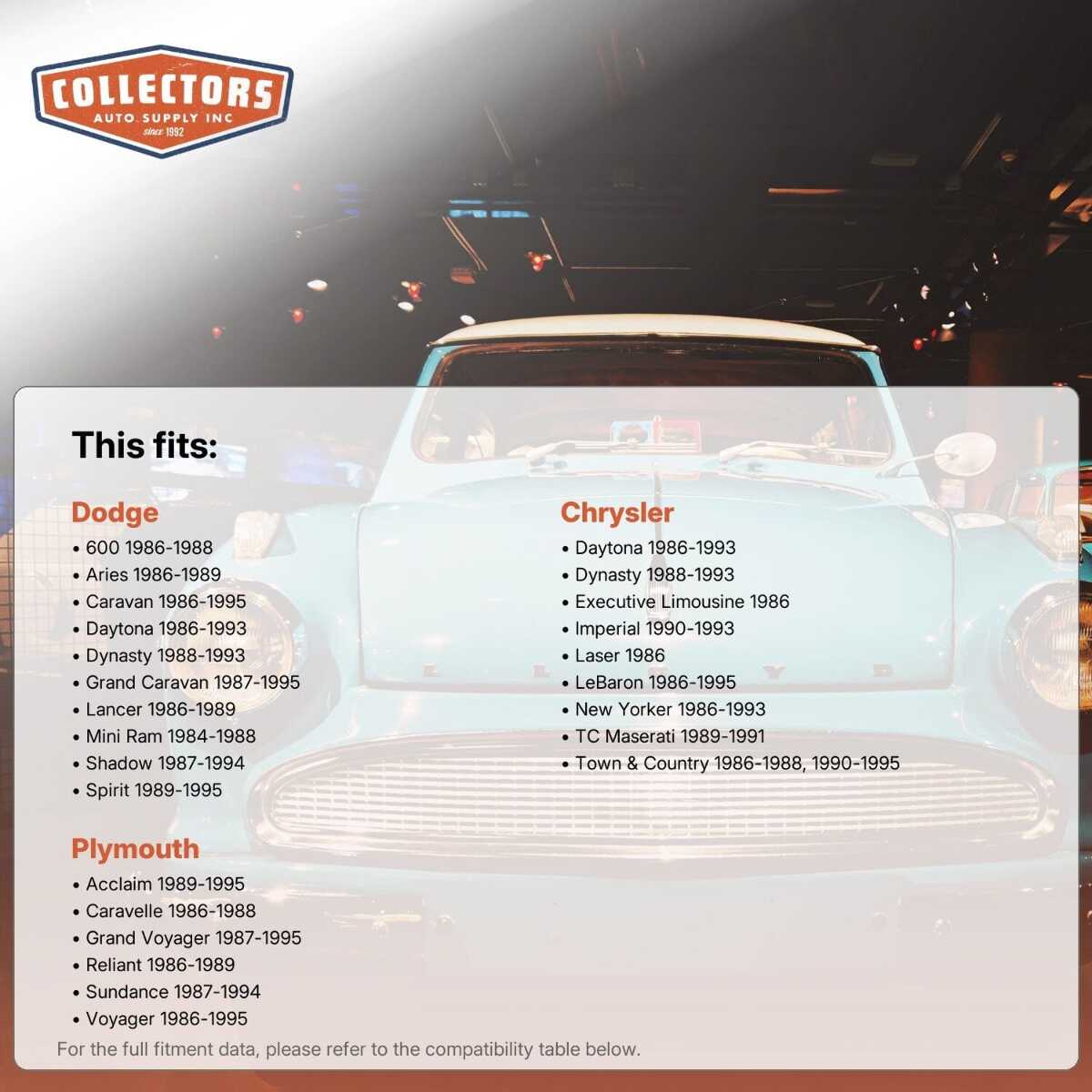 This auto part is covered by Collectors Auto Supply's three-dimensional promise — you'll get the right part the first time, you can talk to us, and with over 25 years in business and 100,000+ customer transactions, you can trust us to be the right choice to fuel your passion.