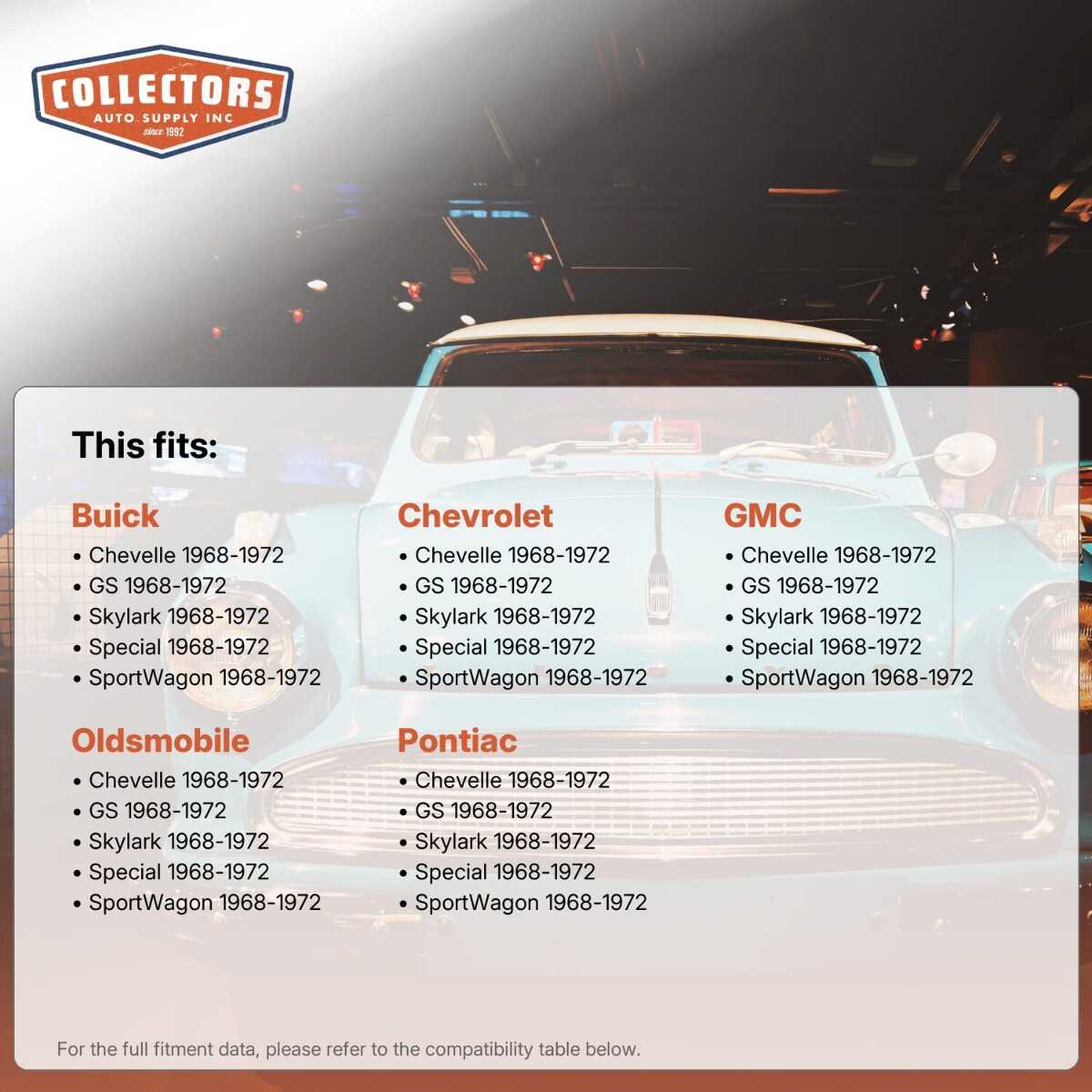 You can purchase this product directly from Collectors Auto Supply, where we specialize in classic car restoration parts and accessories. Finding the perfect part for your classic car can be difficult, and even frustrating. And let us be honest. What makes it worse is a general lack of customer love in the industry. That is why we are here, and that is why we are different. We are car people just like you, and we know what you need. And if we do not already know it, we're listening. So, contact us if you need help finding a part, or have an idea for how to improve our website, or anything else. Or if you want to do it the old-fashioned way, give us a call at 1 (800) 414-4462.