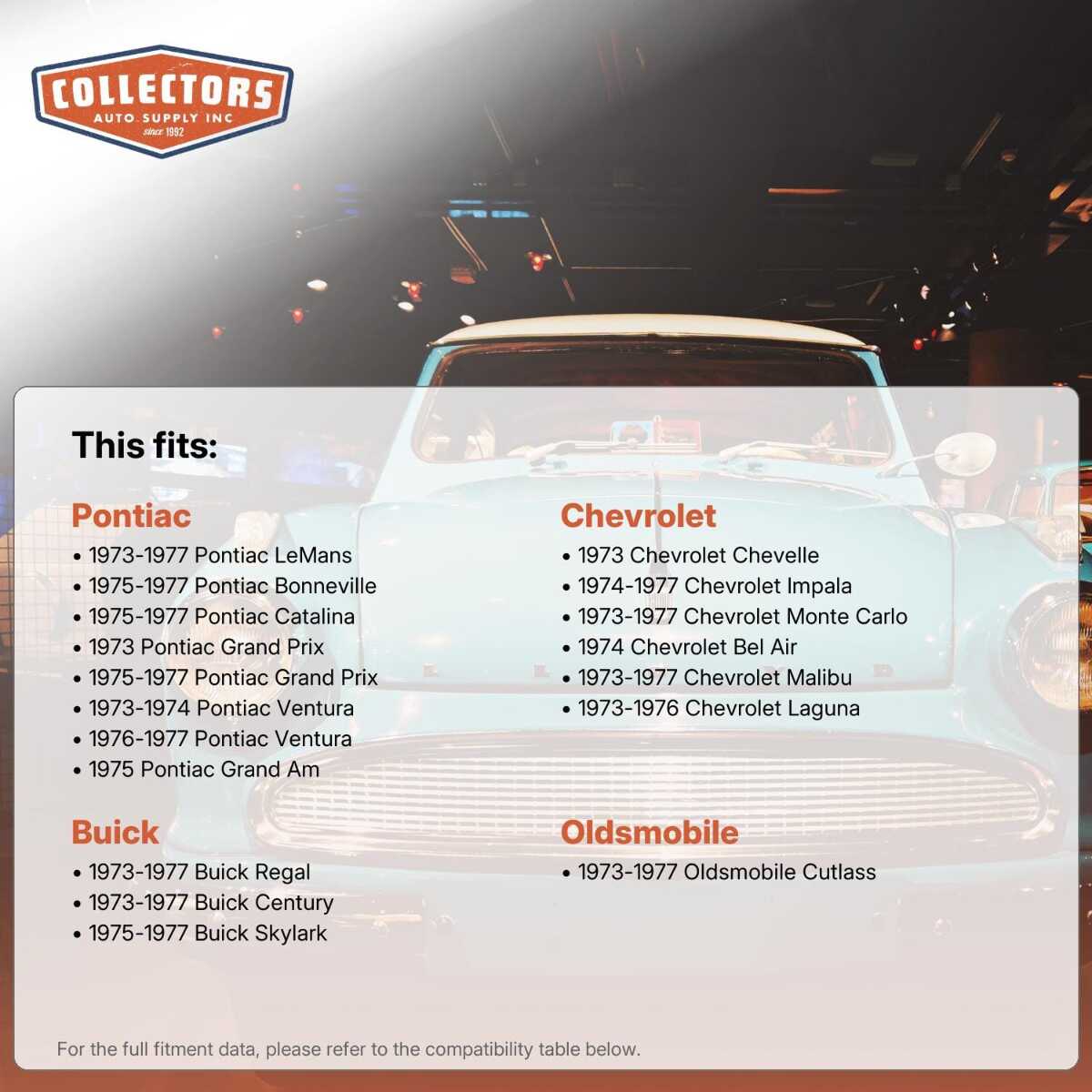 You can purchase this product directly from Collectors Auto Supply, where we specialize in classic car restoration parts and accessories. Finding the perfect part for your classic car can be difficult, and even frustrating. And let us be honest. What makes it worse is a general lack of customer love in the industry. That is why we are here, and that is why we are different. We are car people just like you, and we know what you need. And if we do not already know it, we're listening. So, contact us if you need help finding a part, or have an idea for how to improve our website, or anything else. Or if you want to do it the old-fashioned way, give us a call at 1 (800) 414-4462.