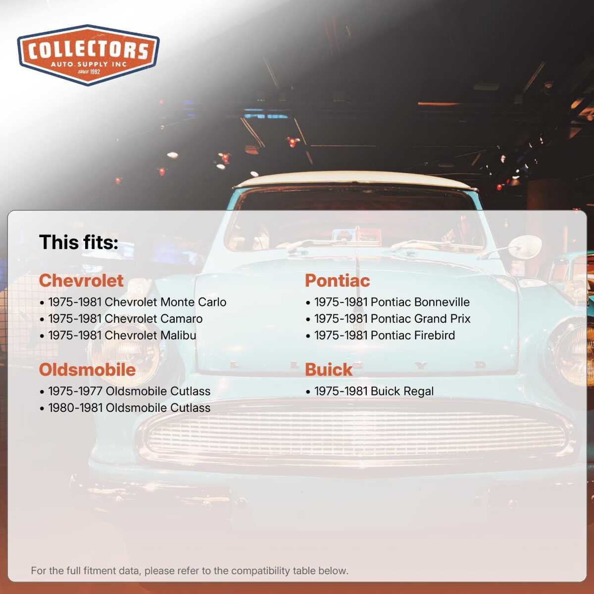 You can purchase this product directly from Collectors Auto Supply, where we specialize in classic car restoration parts and accessories. Finding the perfect part for your classic car can be difficult, and even frustrating. And let us be honest. What makes it worse is a general lack of customer love in the industry. That is why we are here, and that is why we are different. We are car people just like you, and we know what you need. And if we do not already know it, we're listening. So, contact us if you need help finding a part, or have an idea for how to improve our website, or anything else. Or if you want to do it the old-fashioned way, give us a call at 1 (800) 414-4462.