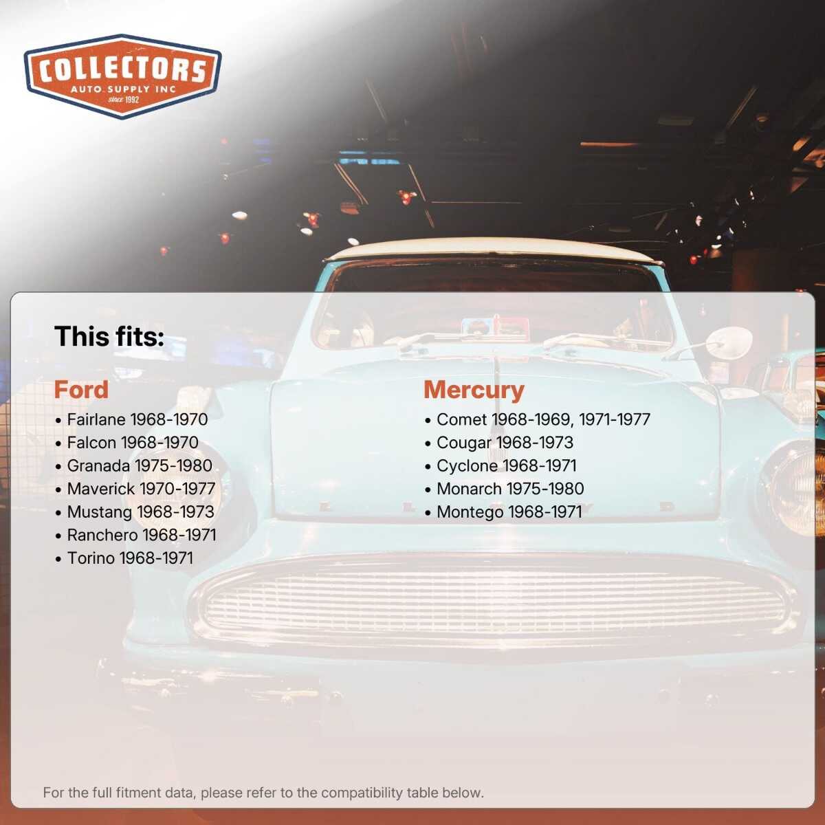 This auto part is covered by Collector's Auto Supply's three-dimensional promiseÑyou'll get the right part the first time, you can talk to us; and with over 25 years in business and 100,000+ customer transactions, you can trust us to be the right choice to fuel your passion.