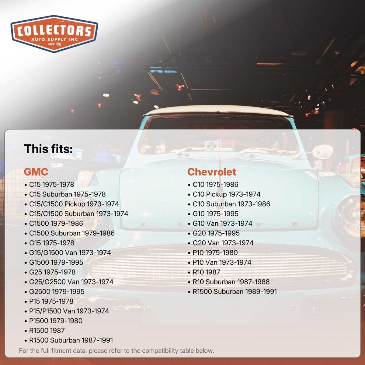 This auto part is covered by Collector's Auto Supply's three-dimensional promiseÑyou'll get the right part the first time, you can talk to us; and with over 25 years in business and 100,000+ customer transactions, you can trust us to be the right choice to fuel your passion.