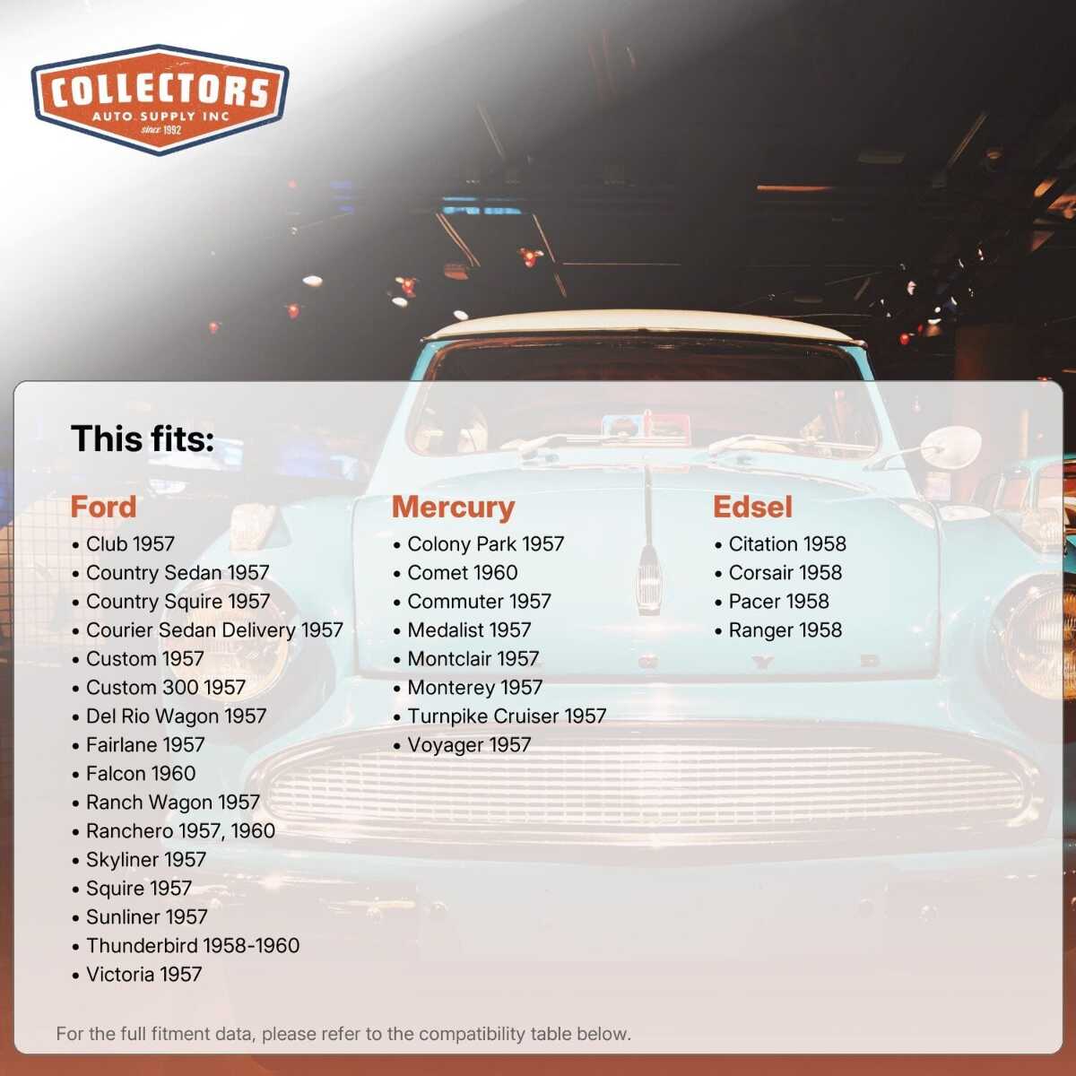 This auto part is covered by Collectors Auto Supply's three-dimensional promise — you'll get the right part the first time, you can talk to us, and with over 25 years in business and 100,000+ customer transactions, you can trust us to be the right choice to fuel your passion.