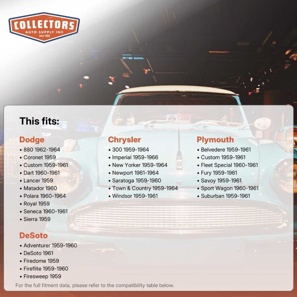You can purchase this product directly from Collectors Auto Supply, where we specialize in classic car restoration parts and accessories. Finding the perfect part for your classic car can be difficult, and even frustrating. And let us be honest. What makes it worse is a general lack of customer love in the industry. That is why we are here, and that is why we are different. We are car people just like you, and we know what you need. And if we do not already know it, we're listening. So, contact us if you need help finding a part, or have an idea for how to improve our website, or anything else. Or if you want to do it the old-fashioned way, give us a call at 1 (800) 414-4462.