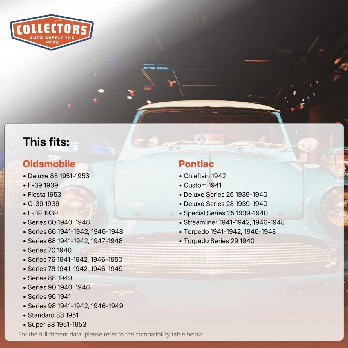 You can purchase this product directly from Collectors Auto Supply, where we specialize in classic car restoration parts and accessories. Finding the perfect part for your classic car can be difficult, and even frustrating. And let us be honest. What makes it worse is a general lack of customer love in the industry. That is why we are here, and that is why we are different. We are car people just like you, and we know what you need. And if we do not already know it, we're listening. So, contact us if you need help finding a part, or have an idea for how to improve our website, or anything else. Or if you want to do it the old-fashioned way, give us a call at 1 (800) 414-4462.